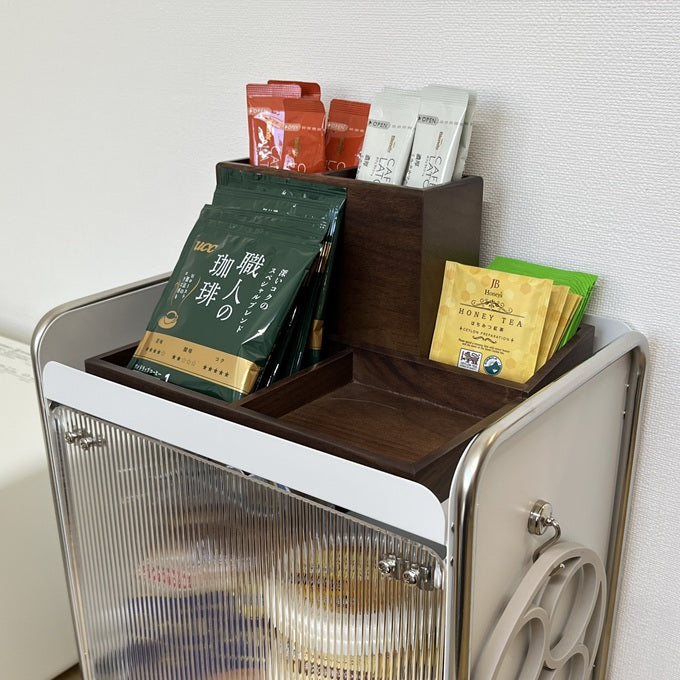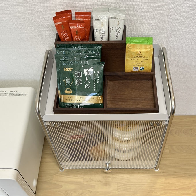 上部はフラットな天板になっているため、お気に入りの小物やディフューザー、時計などをディスプレイするスペースとしても活用可能。見せる収納と隠す収納の両立を叶えるアイテムです。
