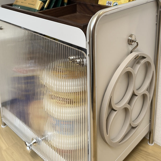 スライド式の扉を採用しており、普段は中身が見えないように目隠しが可能。生活感を隠しながら、すっきりとした印象を保てるのが魅力です。インテリアに馴染みやすく、空間を整えてくれる実用的なデザインです。