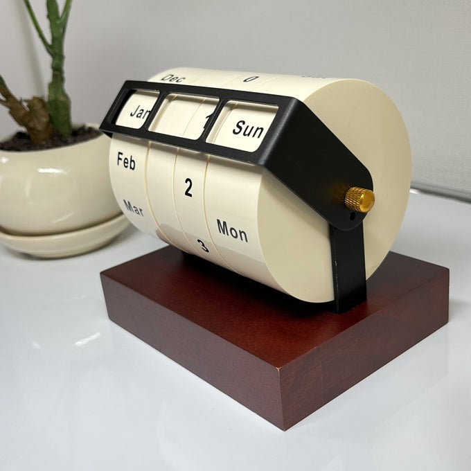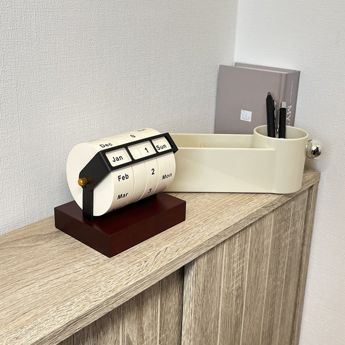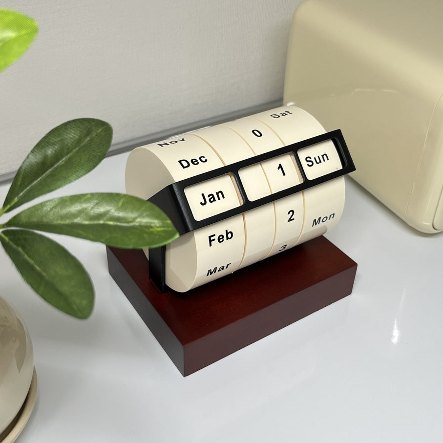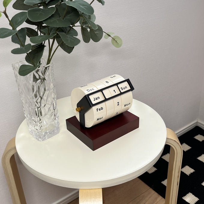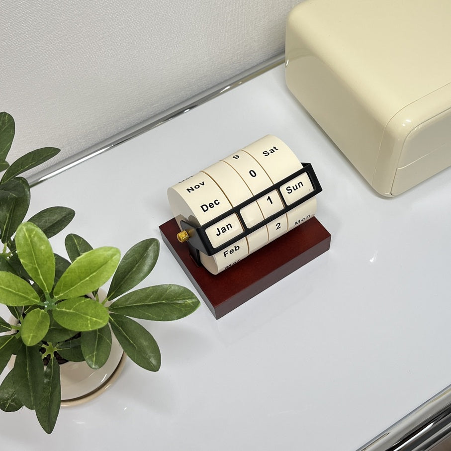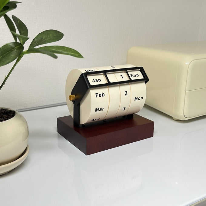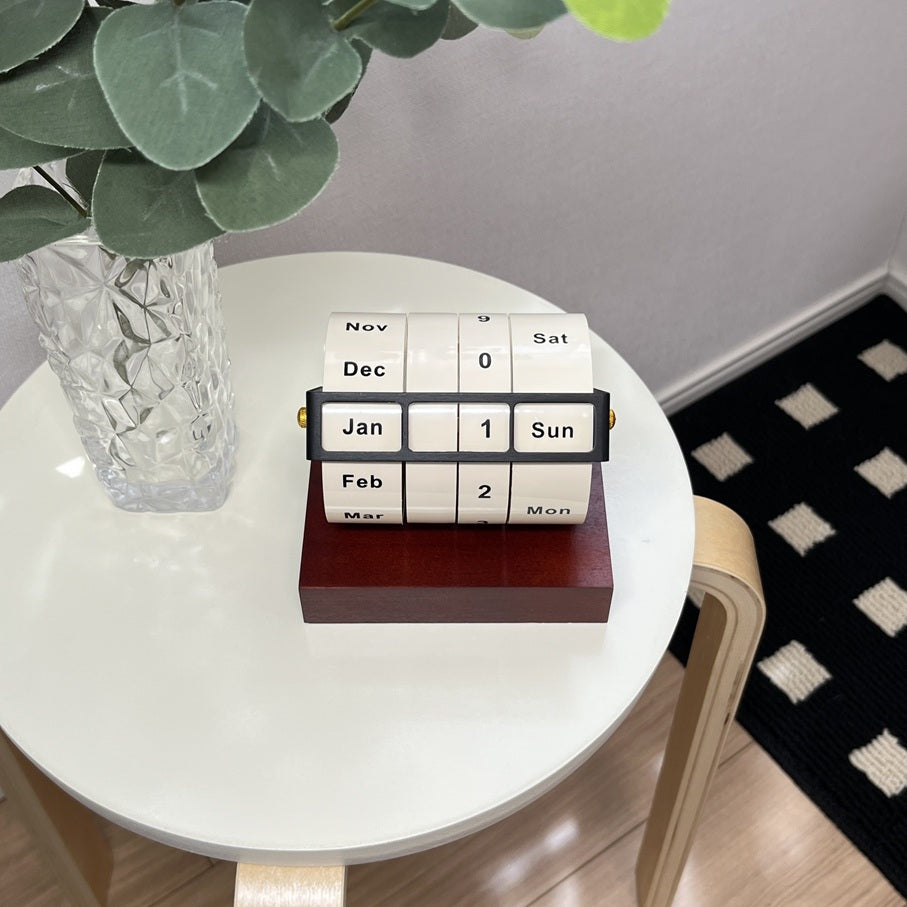 回転式の構造で、各リングをくるっと回すことで月・日・曜日を簡単に変更できます。毎日手を動かして日付を更新する、そのアナログな操作が、どこか心地よく、日々のちょっとした楽しみにもなります。