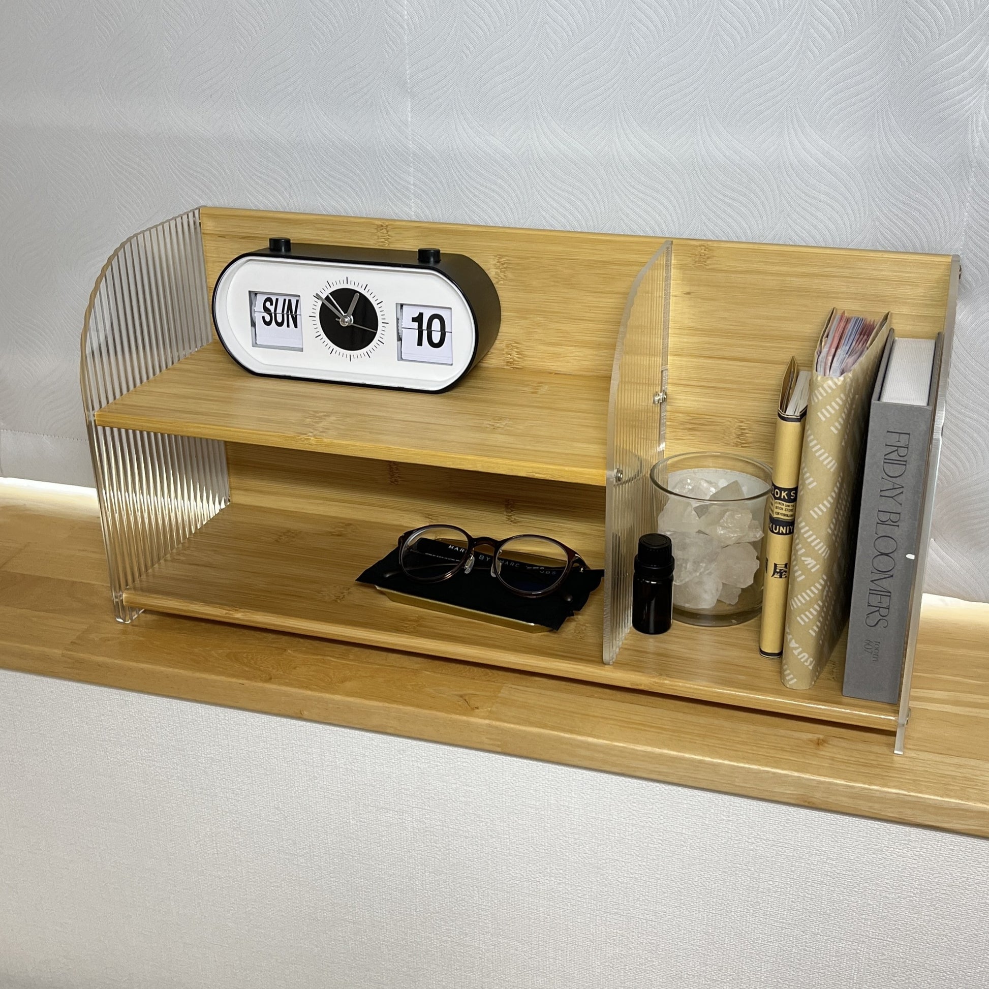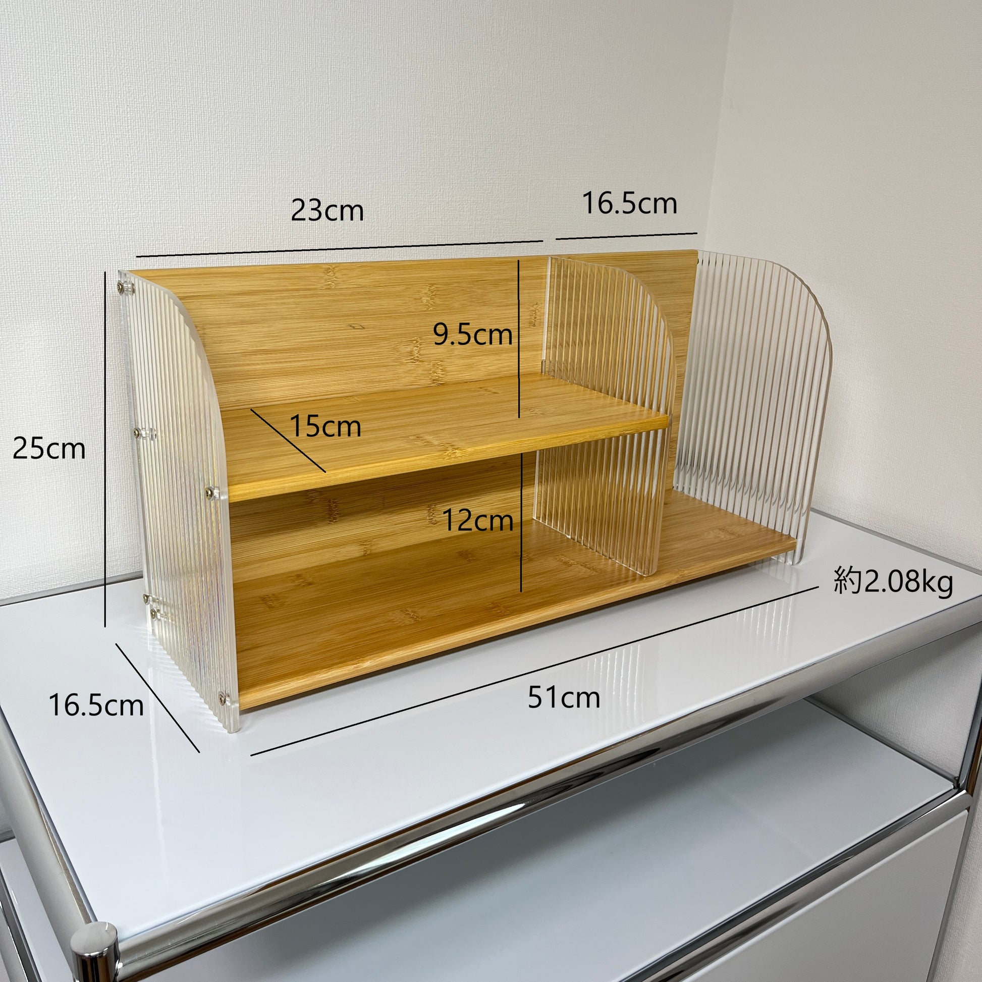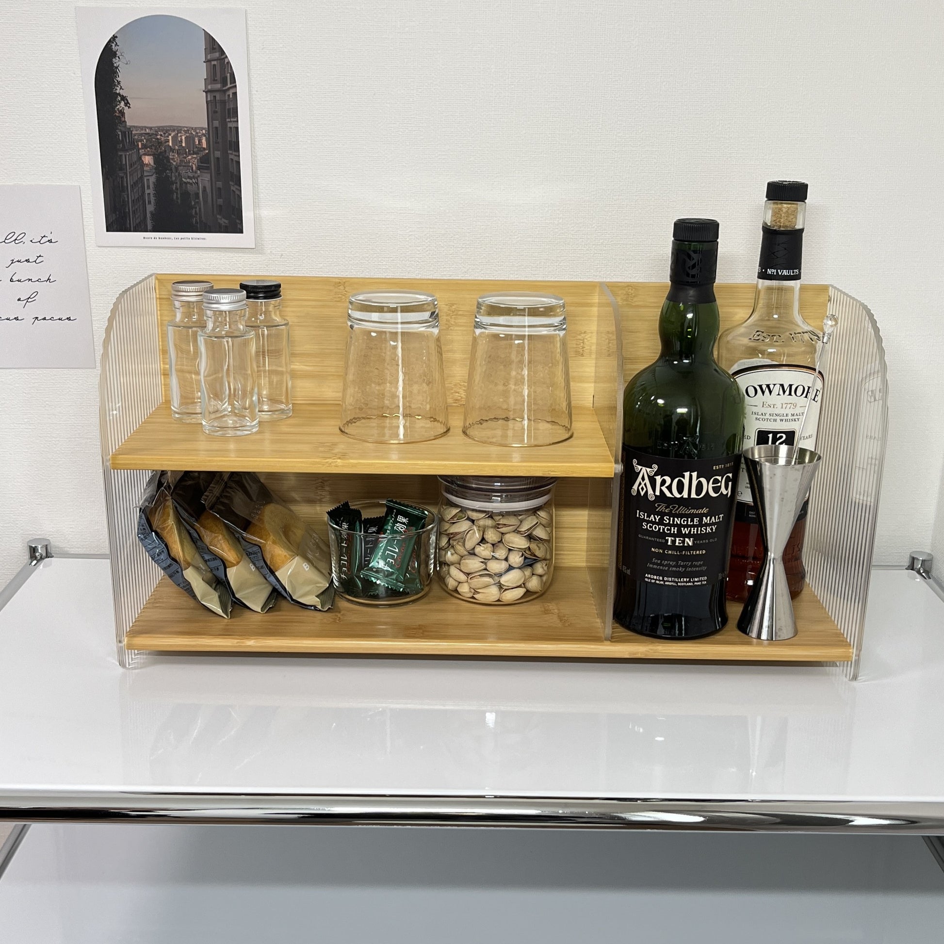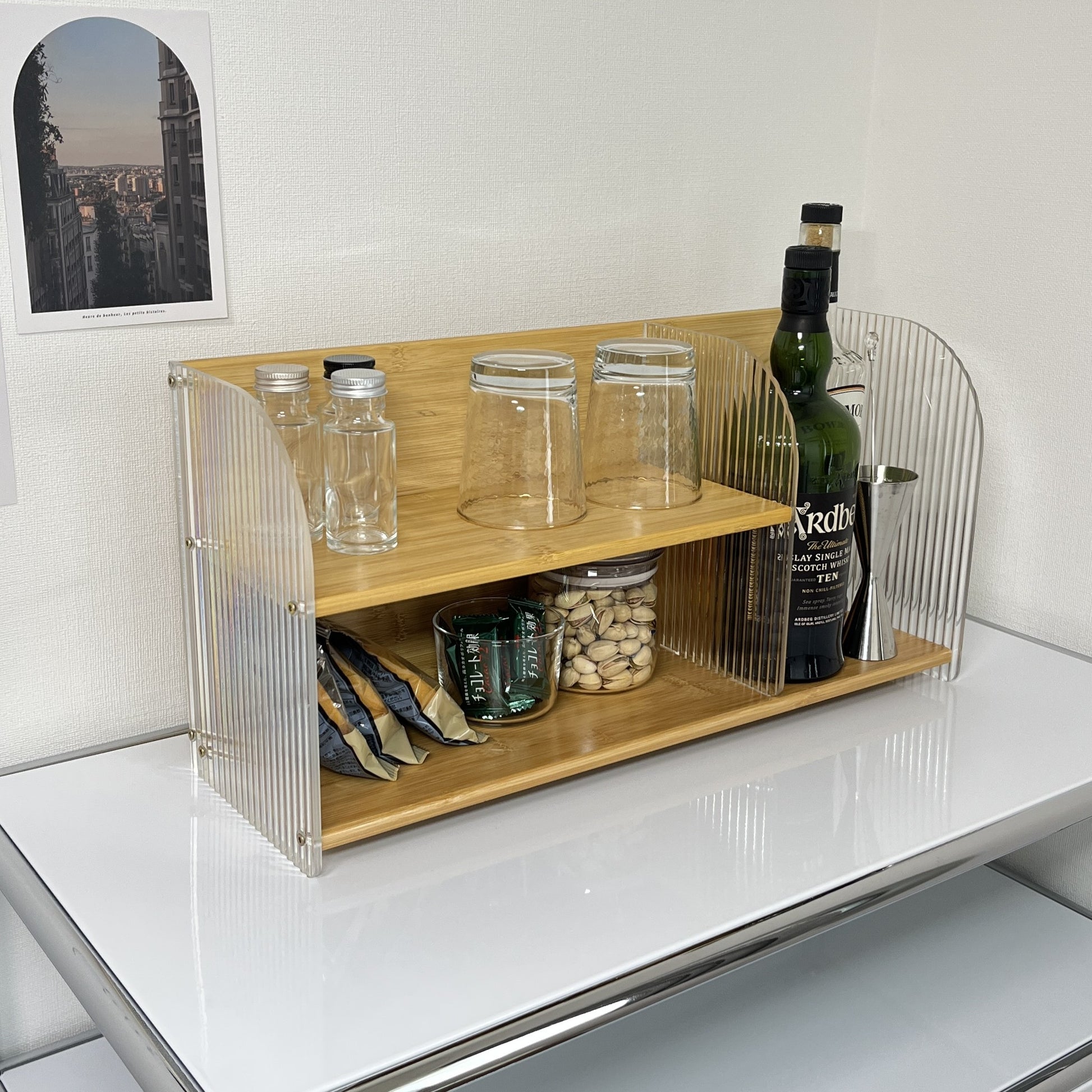 竹とアクリルで作られたこちらのディスプレイラックは、上下2段の設計になっており、リビングの棚上やキッチンのカウンターなど、「あと少し収納が欲しい」場所にぴったり。しっかりと収納力があり、小物や調味料、アロマなどを美しくディスプレイできます。