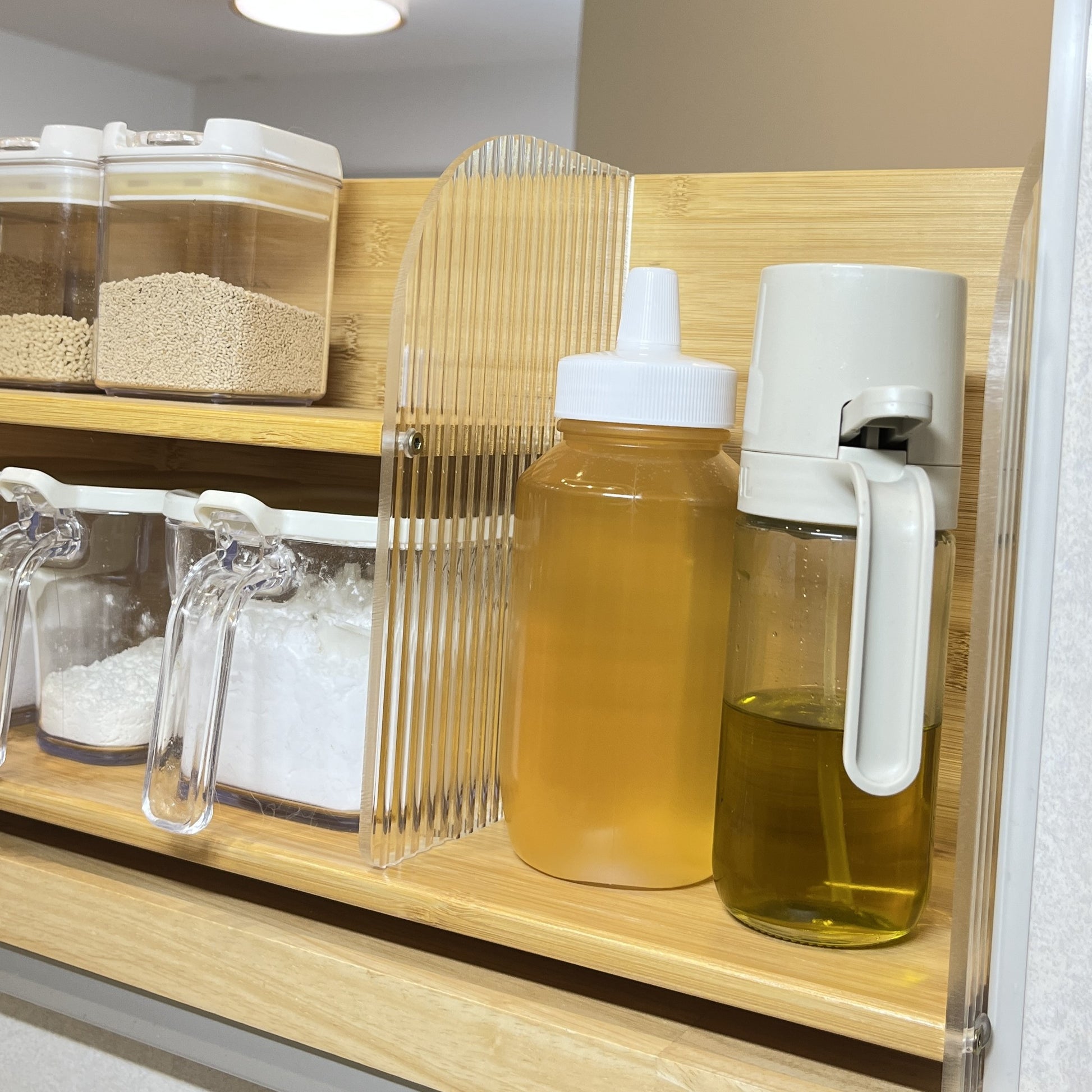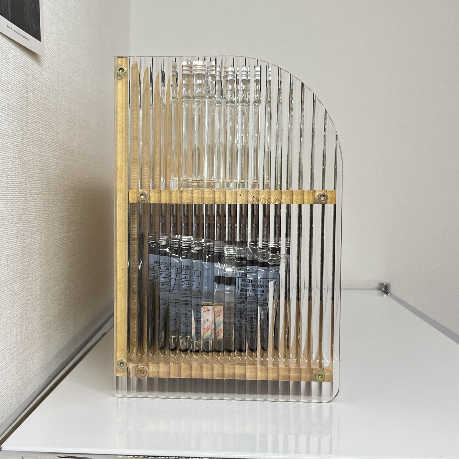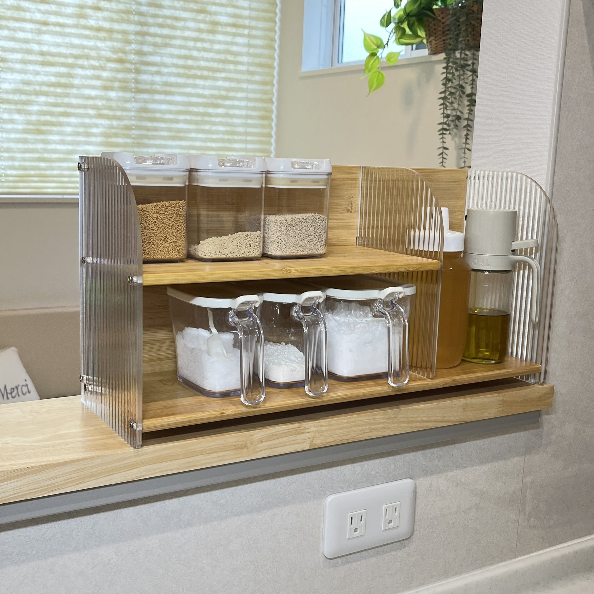 竹とアクリルで作られたこちらのディスプレイラックは、上下2段の設計になっており、リビングの棚上やキッチンのカウンターなど、「あと少し収納が欲しい」場所にぴったり。しっかりと収納力があり、小物や調味料、アロマなどを美しくディスプレイできます。