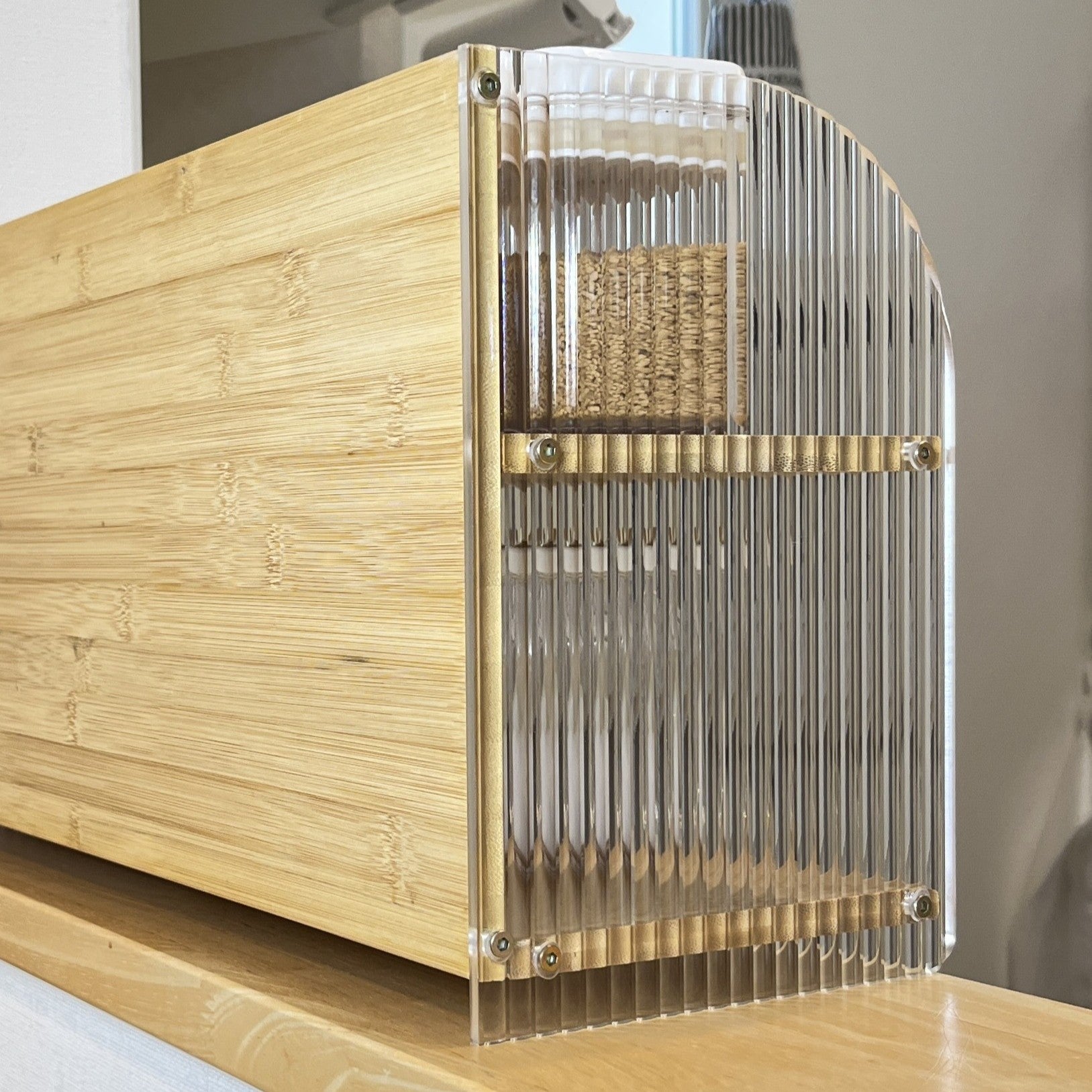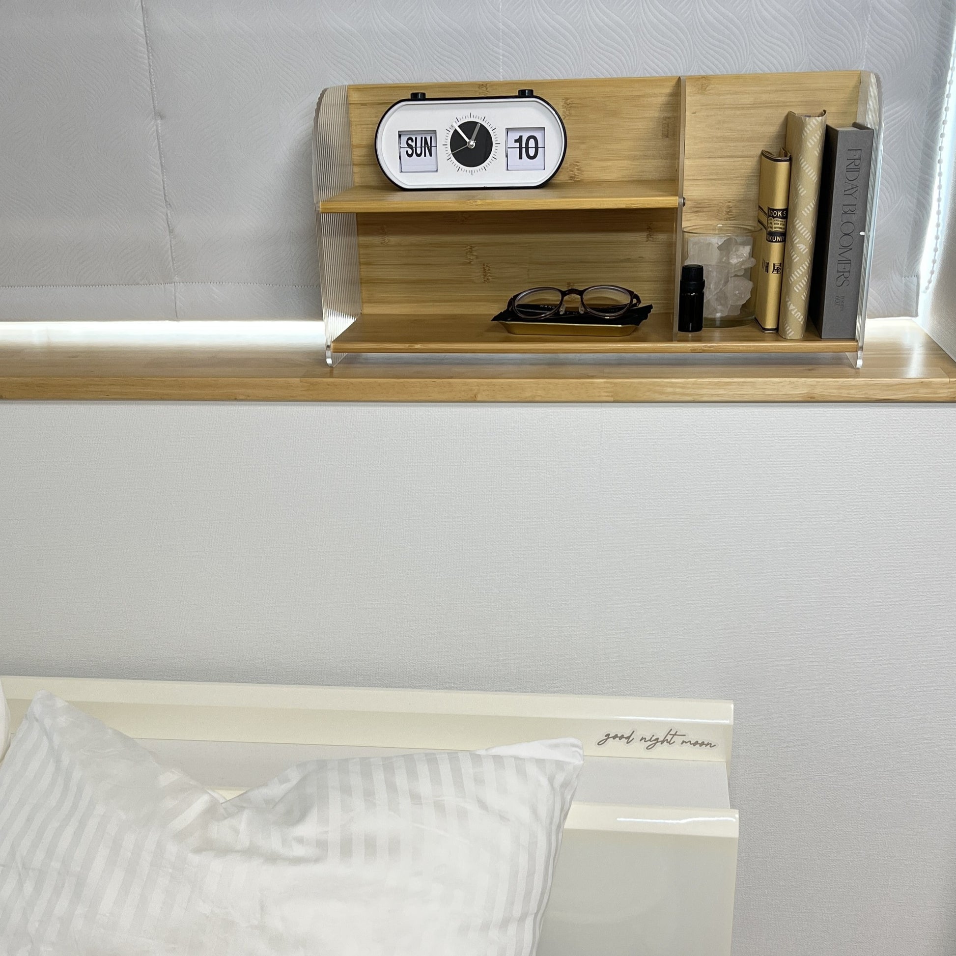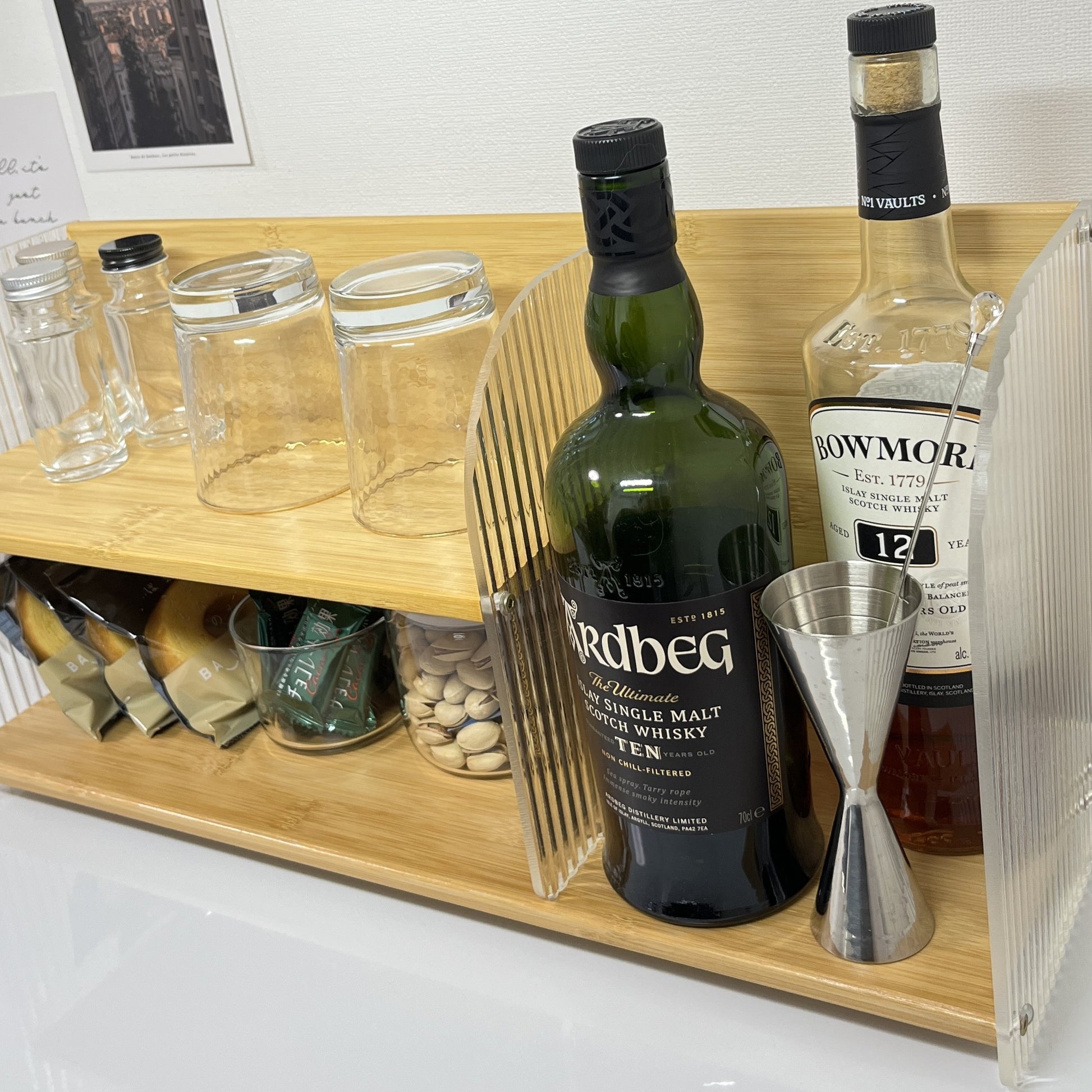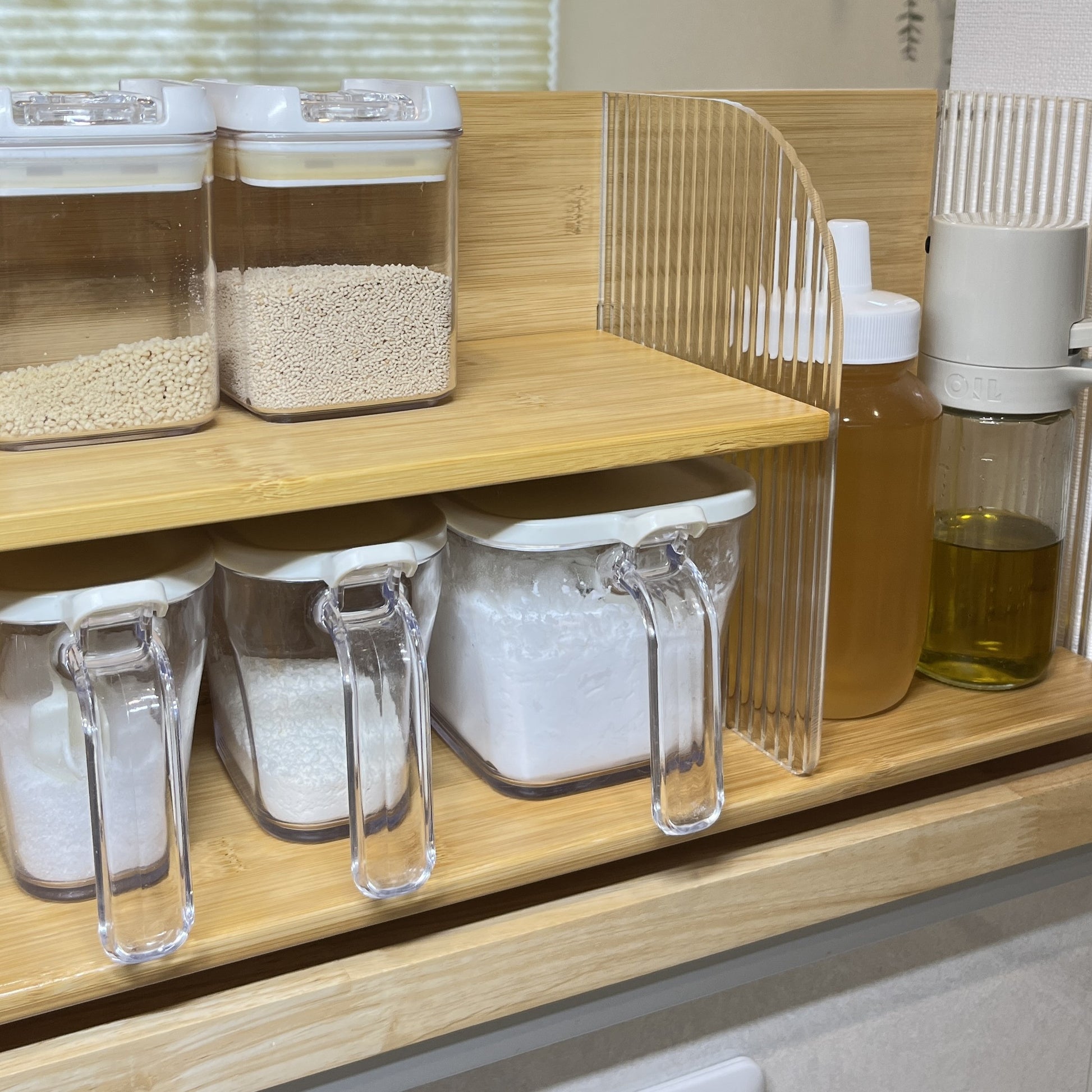 竹とアクリルで作られたこちらのディスプレイラックは、上下2段の設計になっており、リビングの棚上やキッチンのカウンターなど、「あと少し収納が欲しい」場所にぴったり。しっかりと収納力があり、小物や調味料、アロマなどを美しくディスプレイできます。