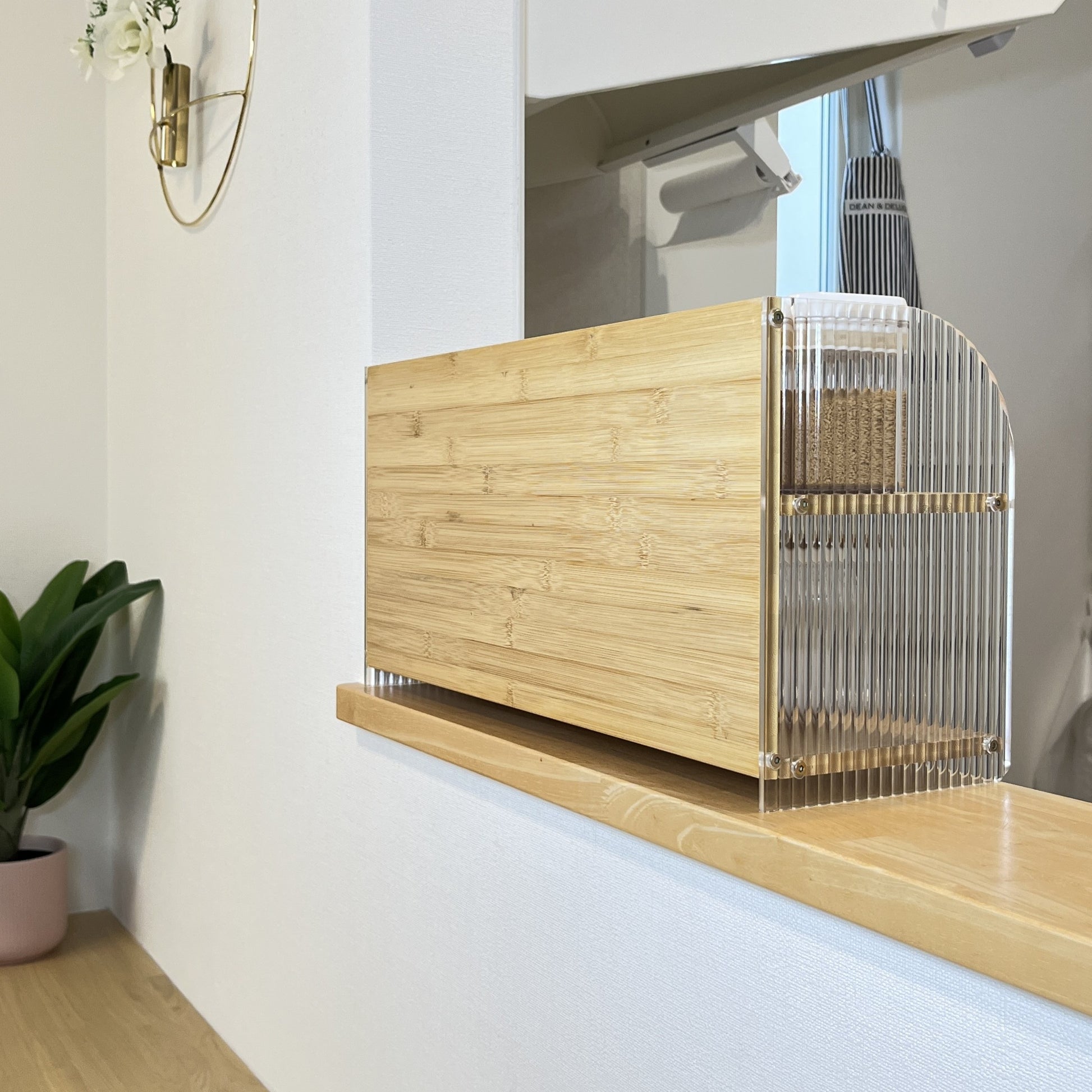 両サイドには半透明のアクリルを採用。光をやわらかく通すことで、圧迫感を抑えながらも空間に抜け感をプラスしてくれます。どんなインテリアにも馴染みやすく、見た目にも洗練された印象を与えてくれます。