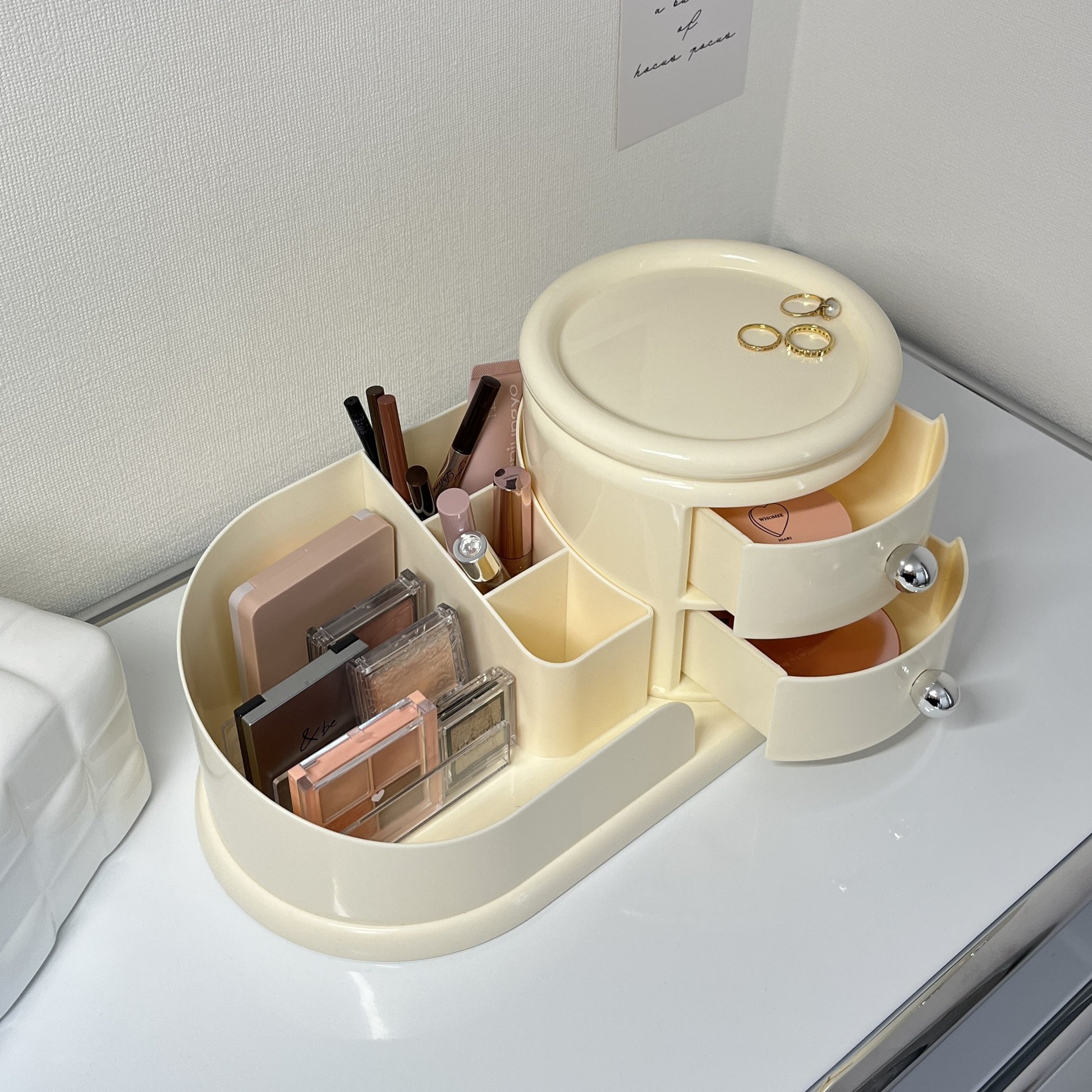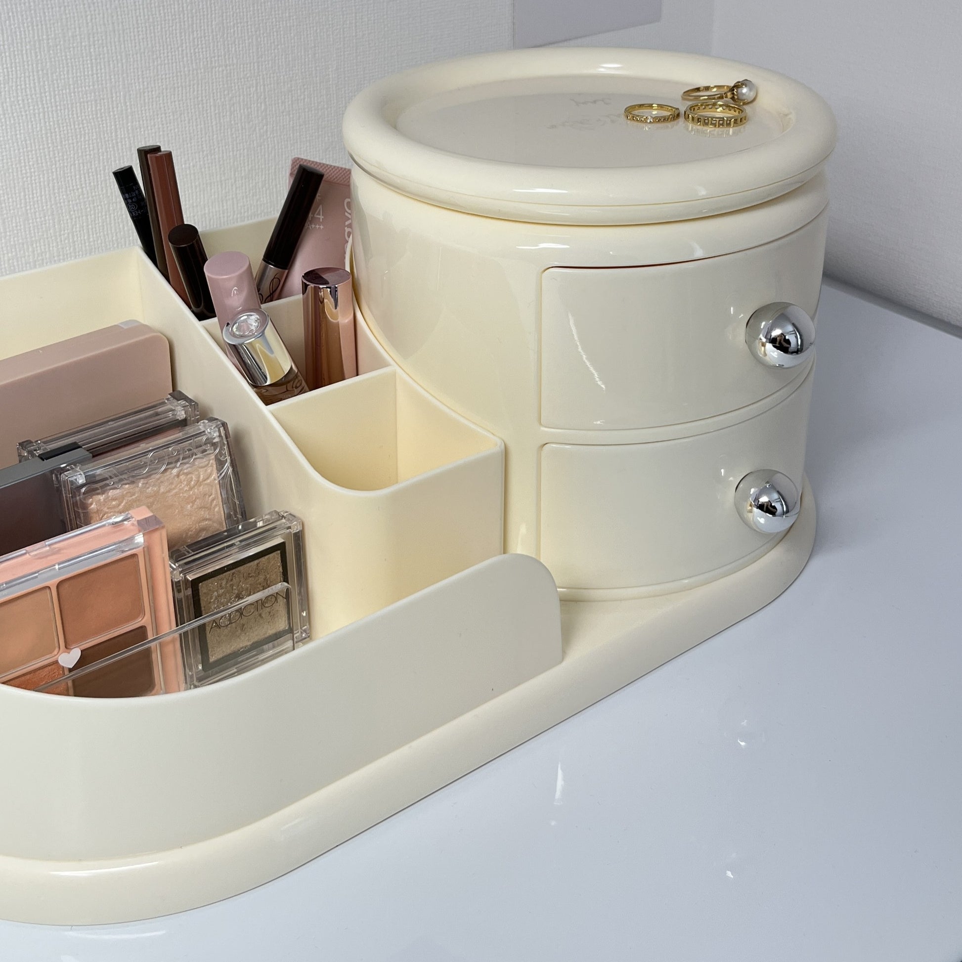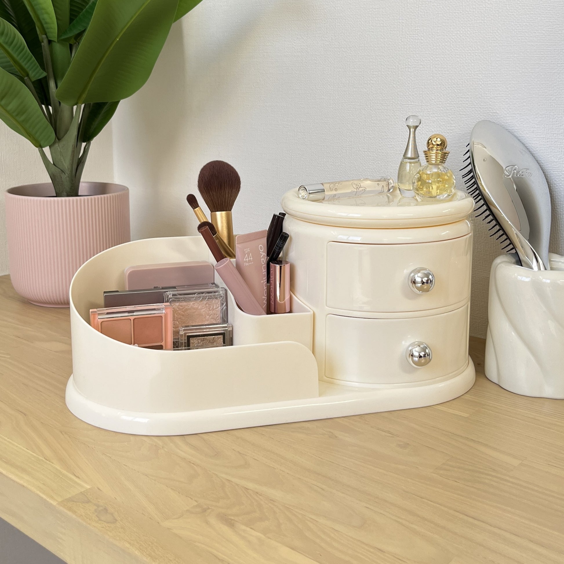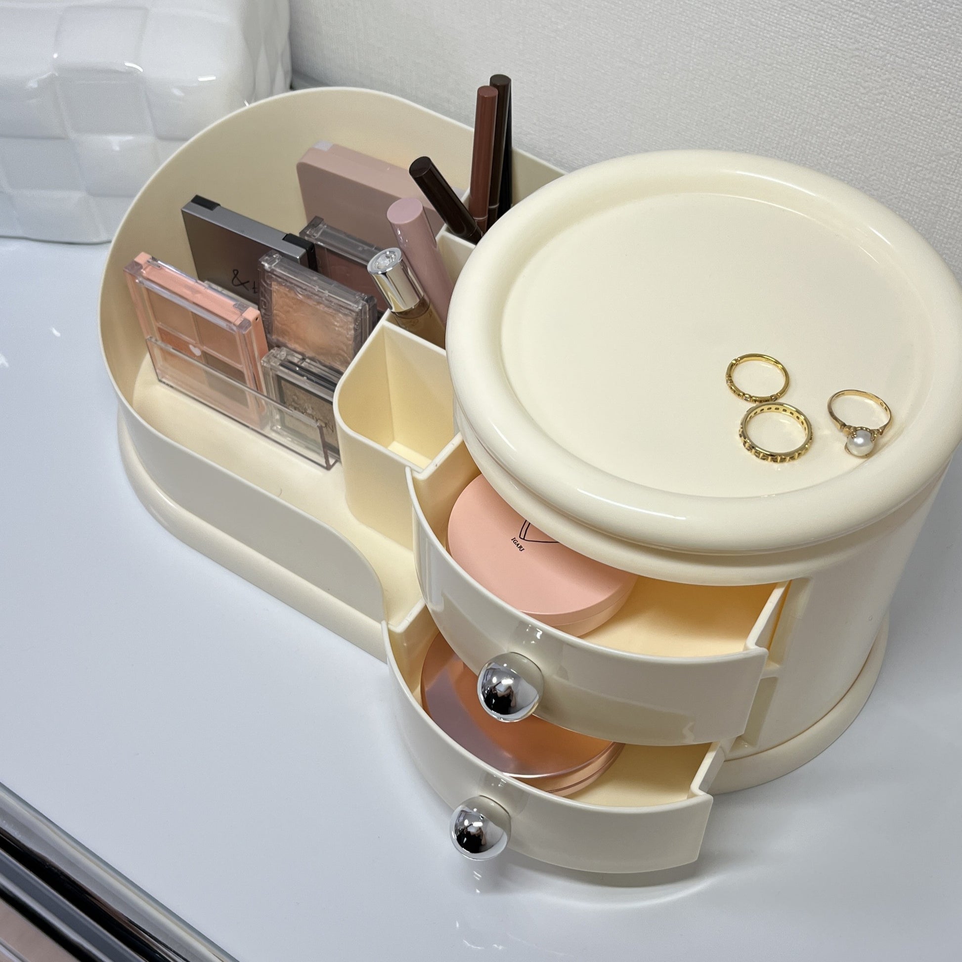 左側はメイクブラシや文具を立てて収納できるスタンド、右側にはすぐ取り出せる2段のオープン引き出し。そして、上部には360度回転するトレイ付きで、アクセサリーやリップなどをサッと手に取れます。毎日使うものこそ、こういう機能的な一台があると便利になります。