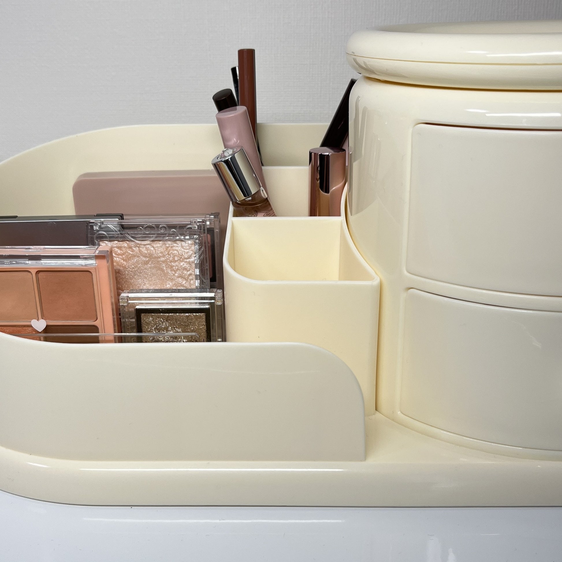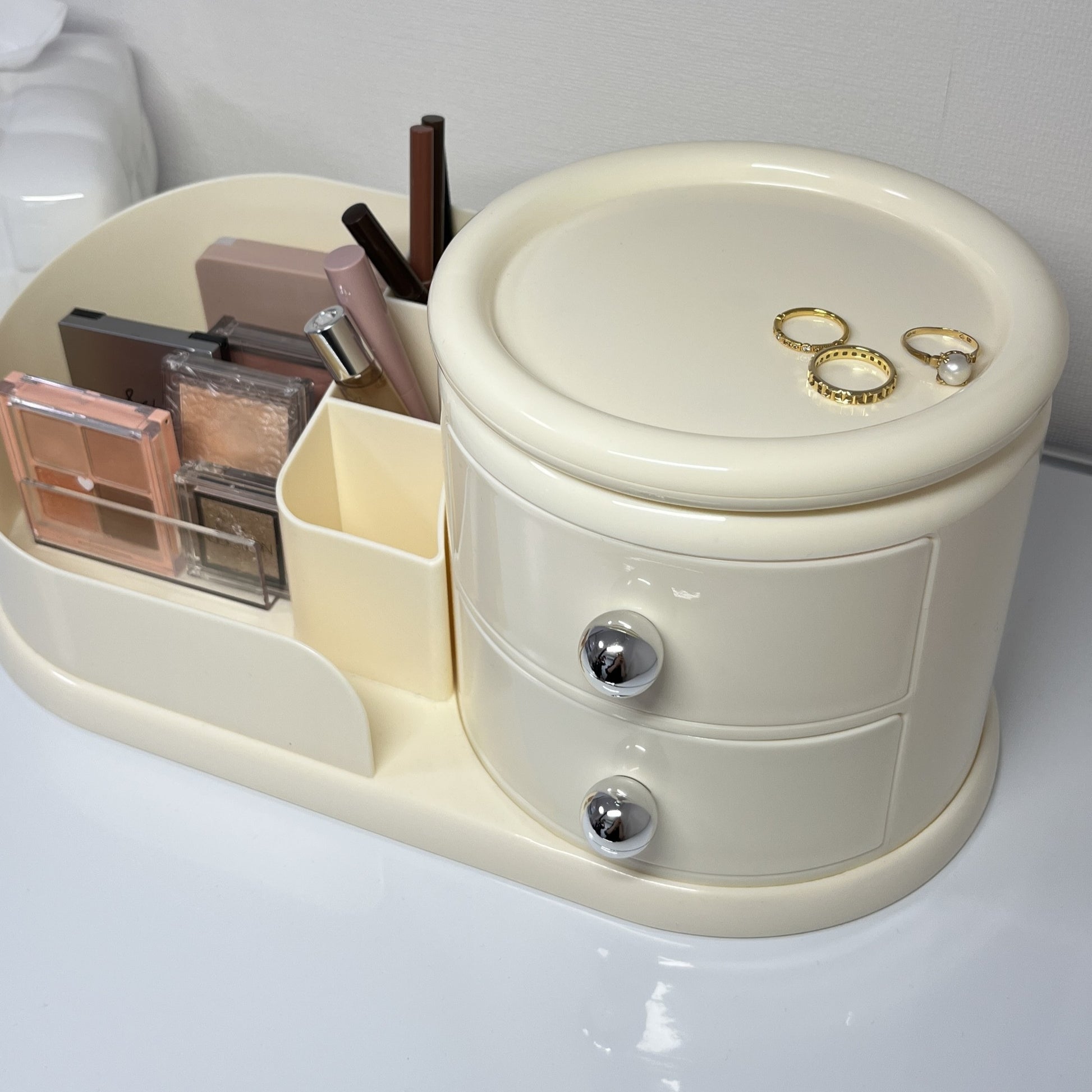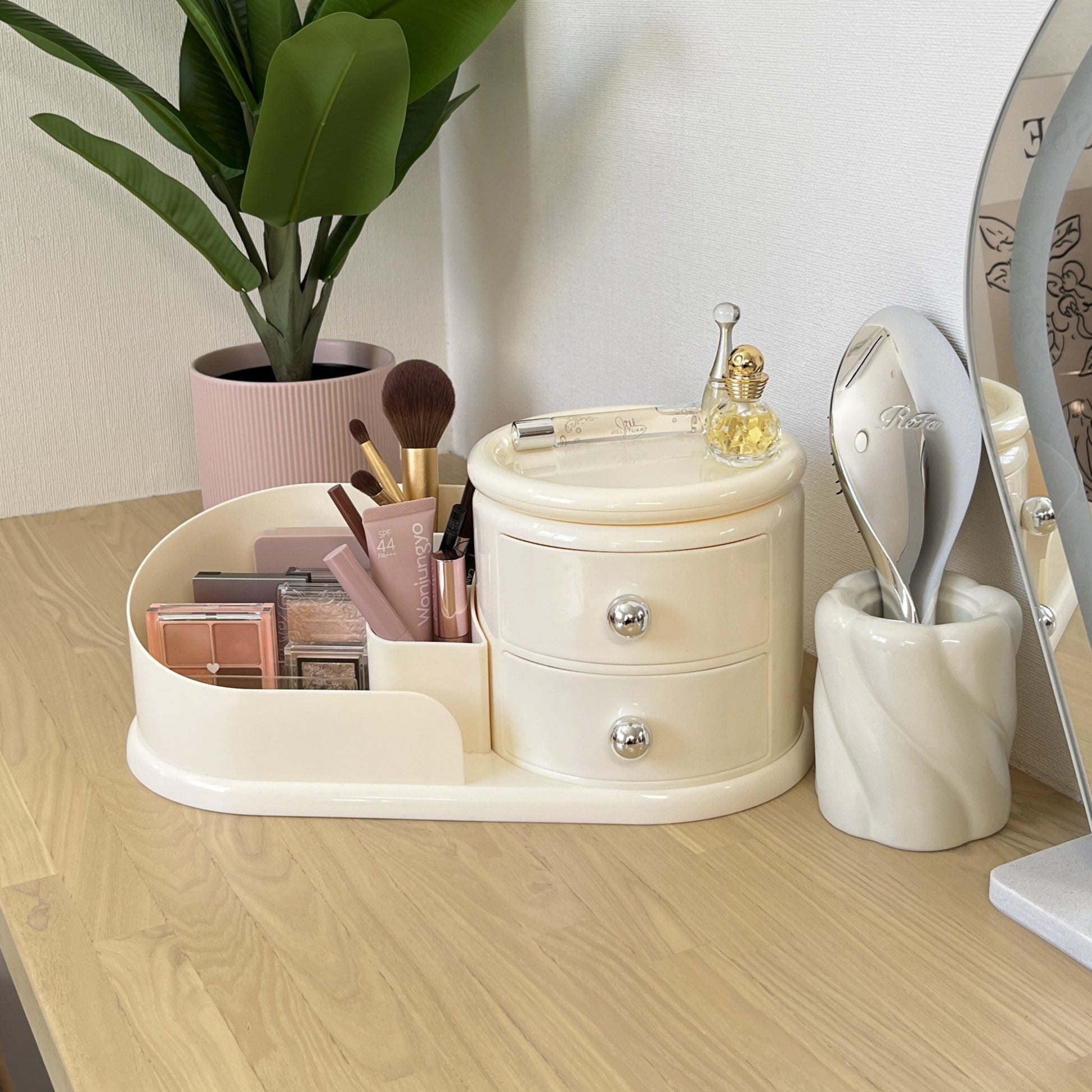 左側はメイクブラシや文具を立てて収納できるスタンド、右側にはすぐ取り出せる2段のオープン引き出し。そして、上部には360度回転するトレイ付きで、アクセサリーやリップなどをサッと手に取れます。毎日使うものこそ、こういう機能的な一台があると便利になります。