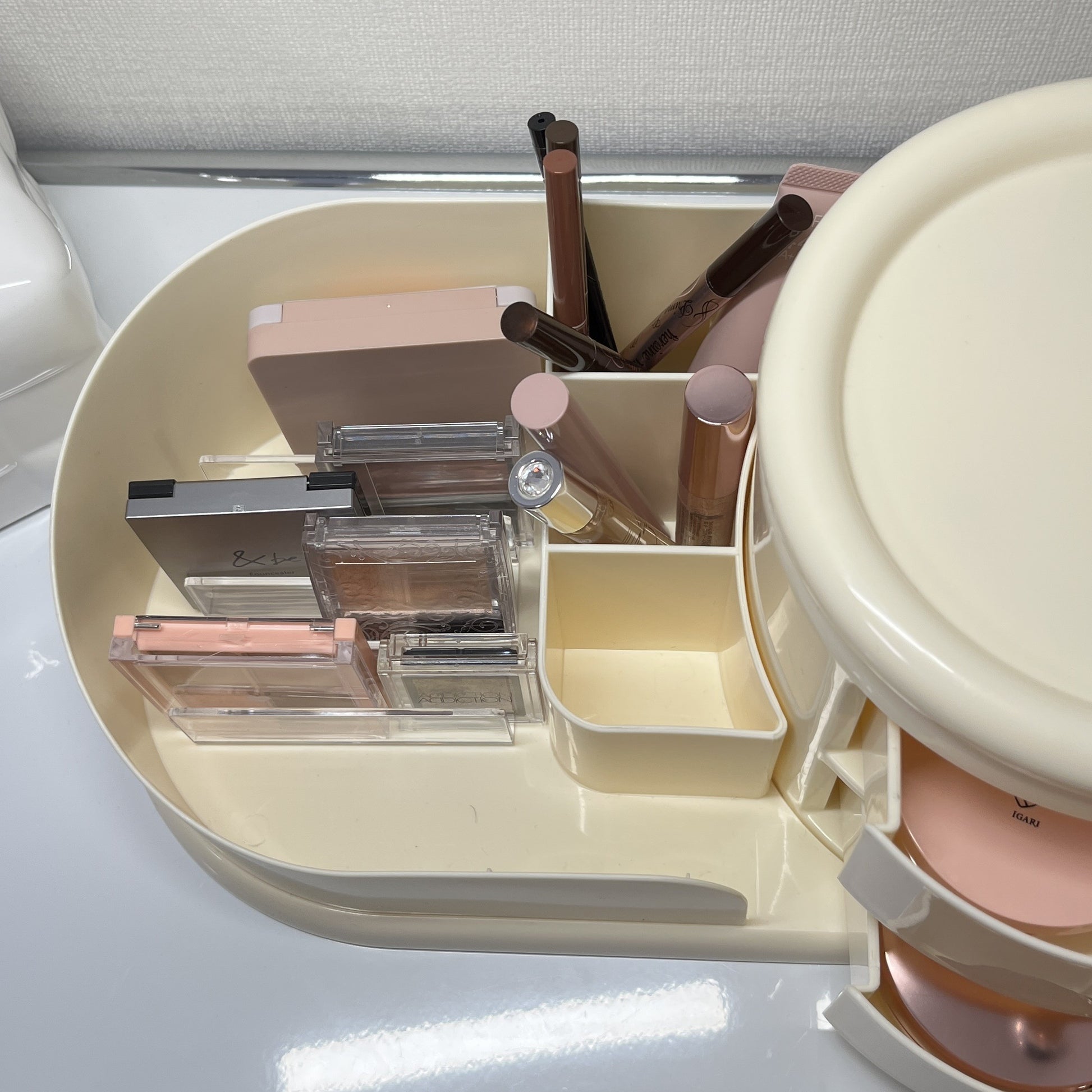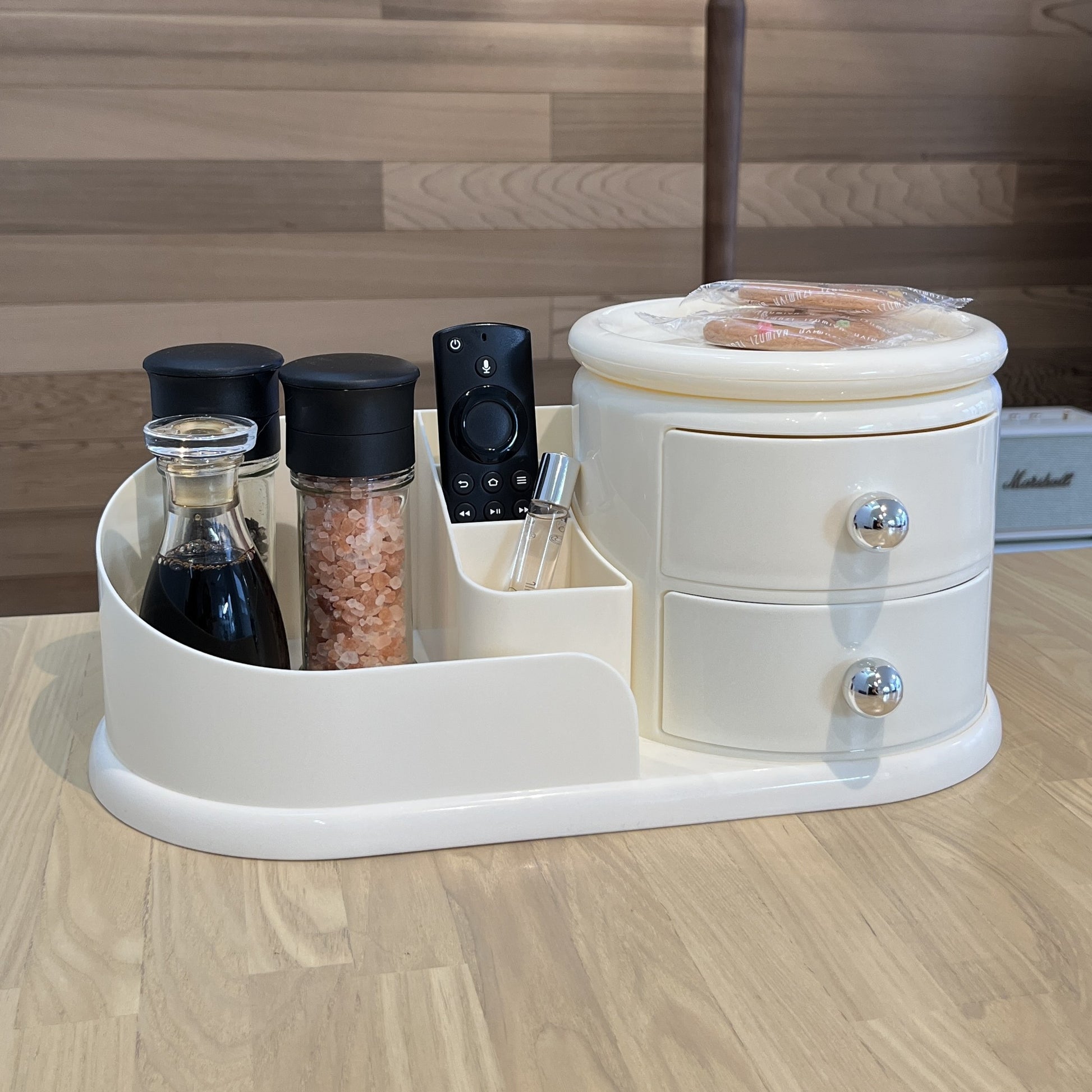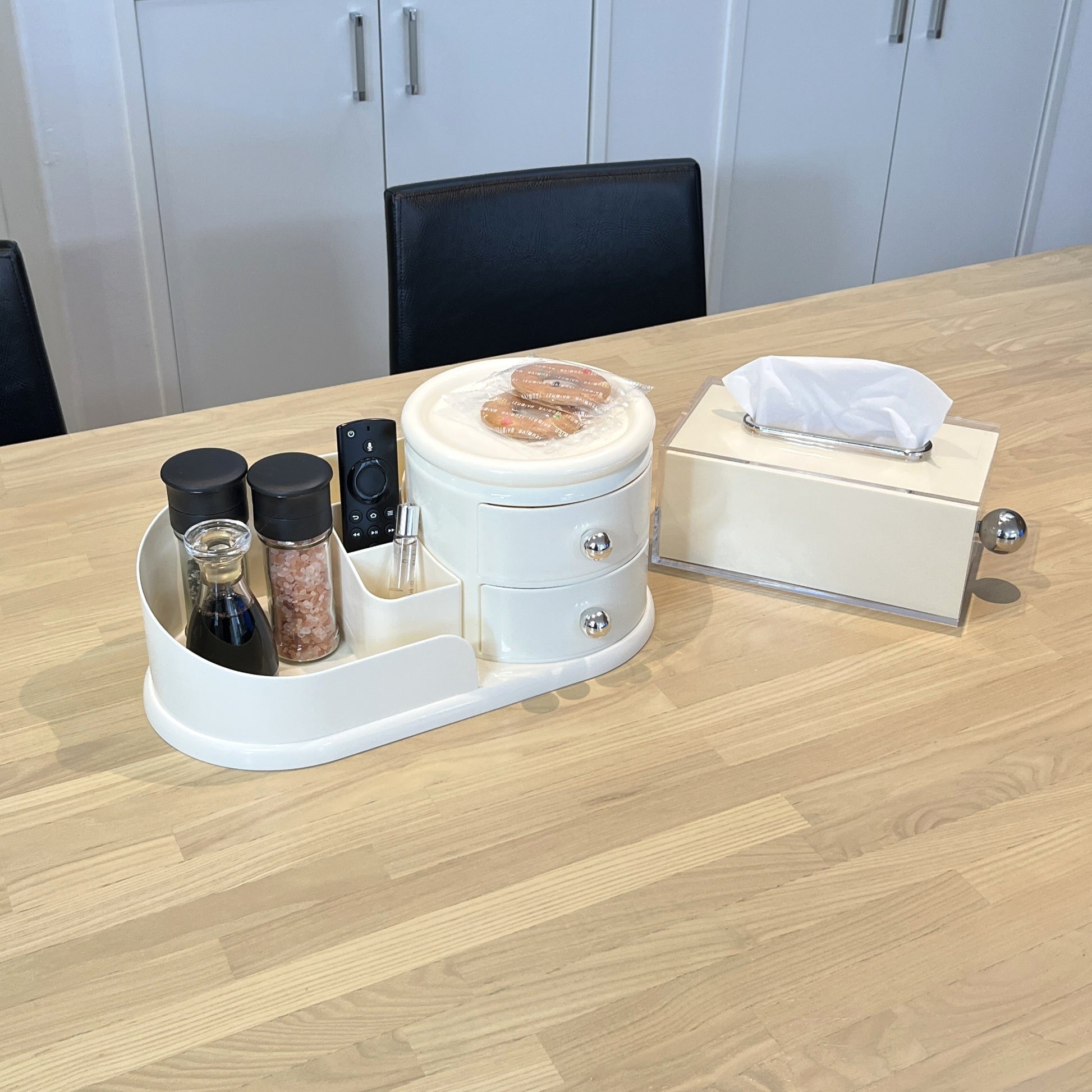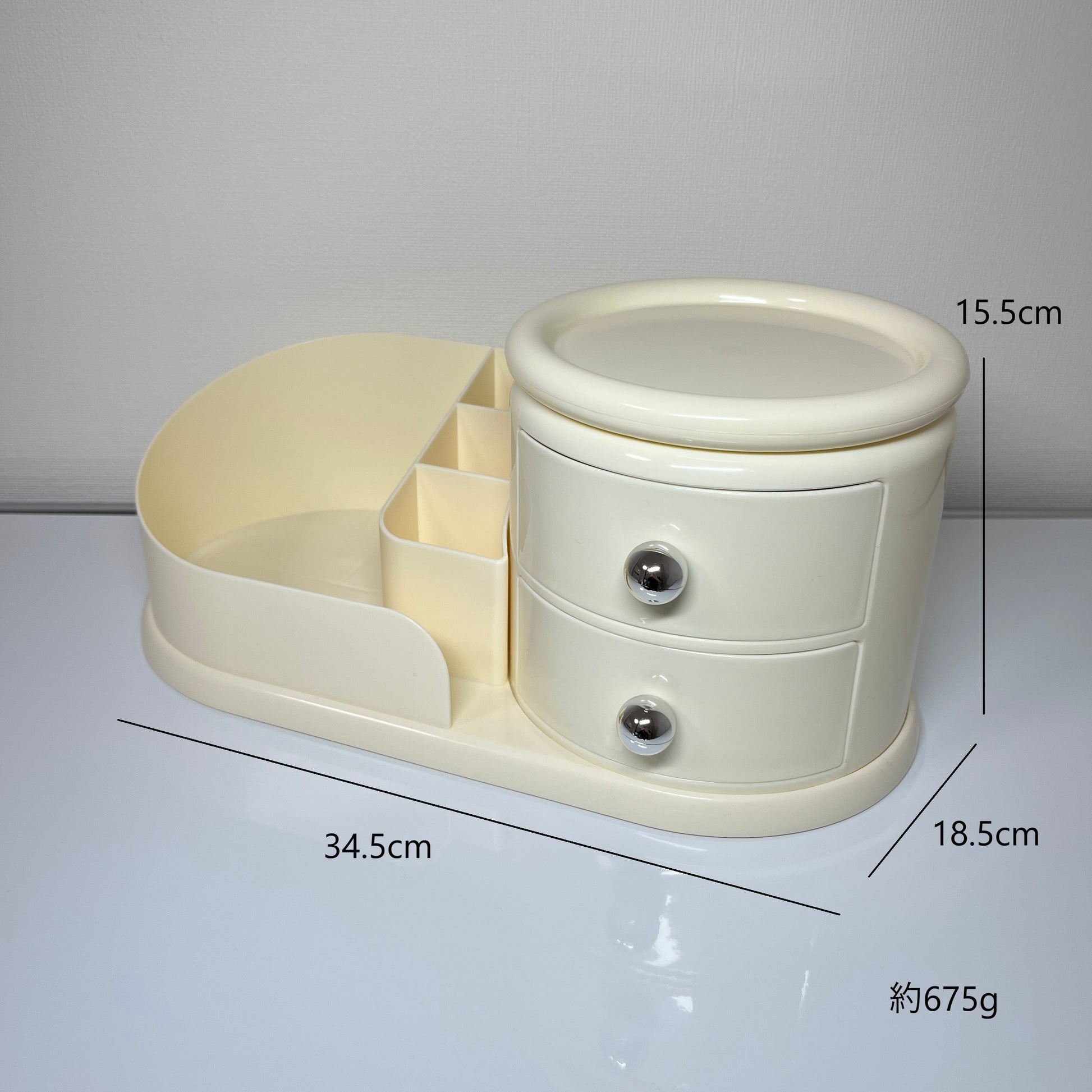 左側はメイクブラシや文具を立てて収納できるスタンド、右側にはすぐ取り出せる2段のオープン引き出し。そして、上部には360度回転するトレイ付きで、アクセサリーやリップなどをサッと手に取れます。毎日使うものこそ、こういう機能的な一台があると便利になります。