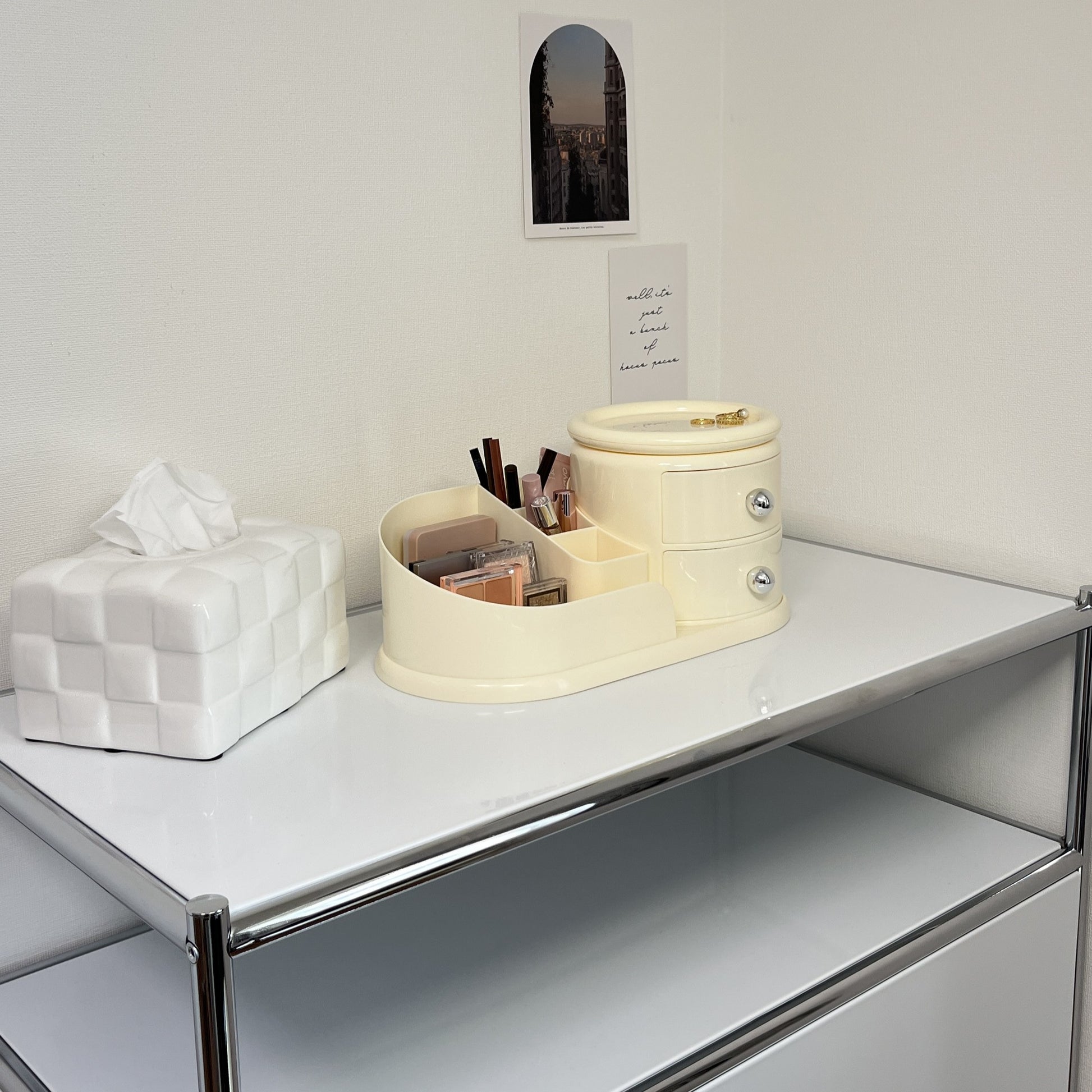 リモコンや文房具はもちろん、メイク道具やアクセサリー、玄関まわりの小物まで。コンパクトながら高い収納力で、どんな場所にもすっと馴染みます。リビング、洗面所、寝室、玄関など…あらゆるシーンで頼りになるアイテムです。