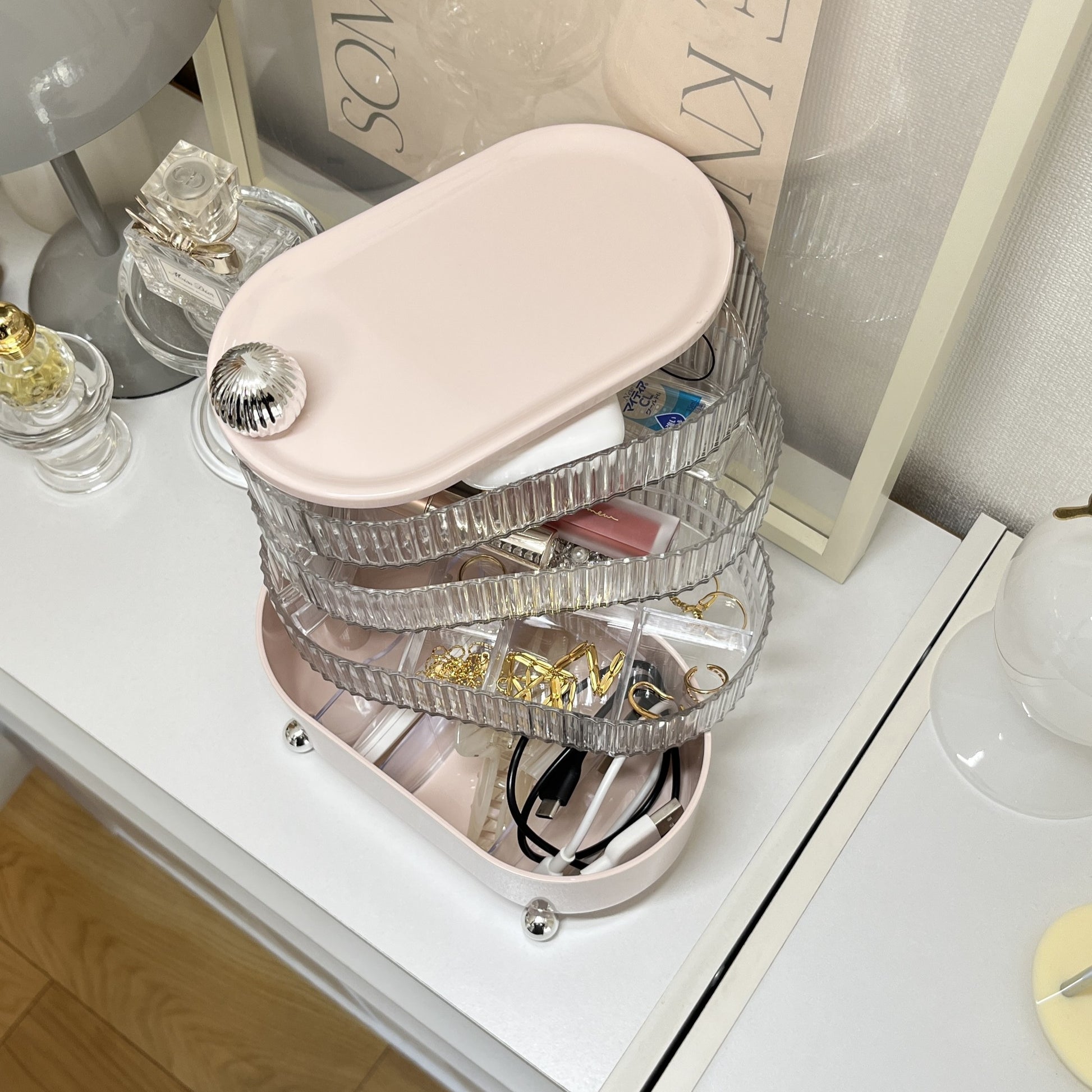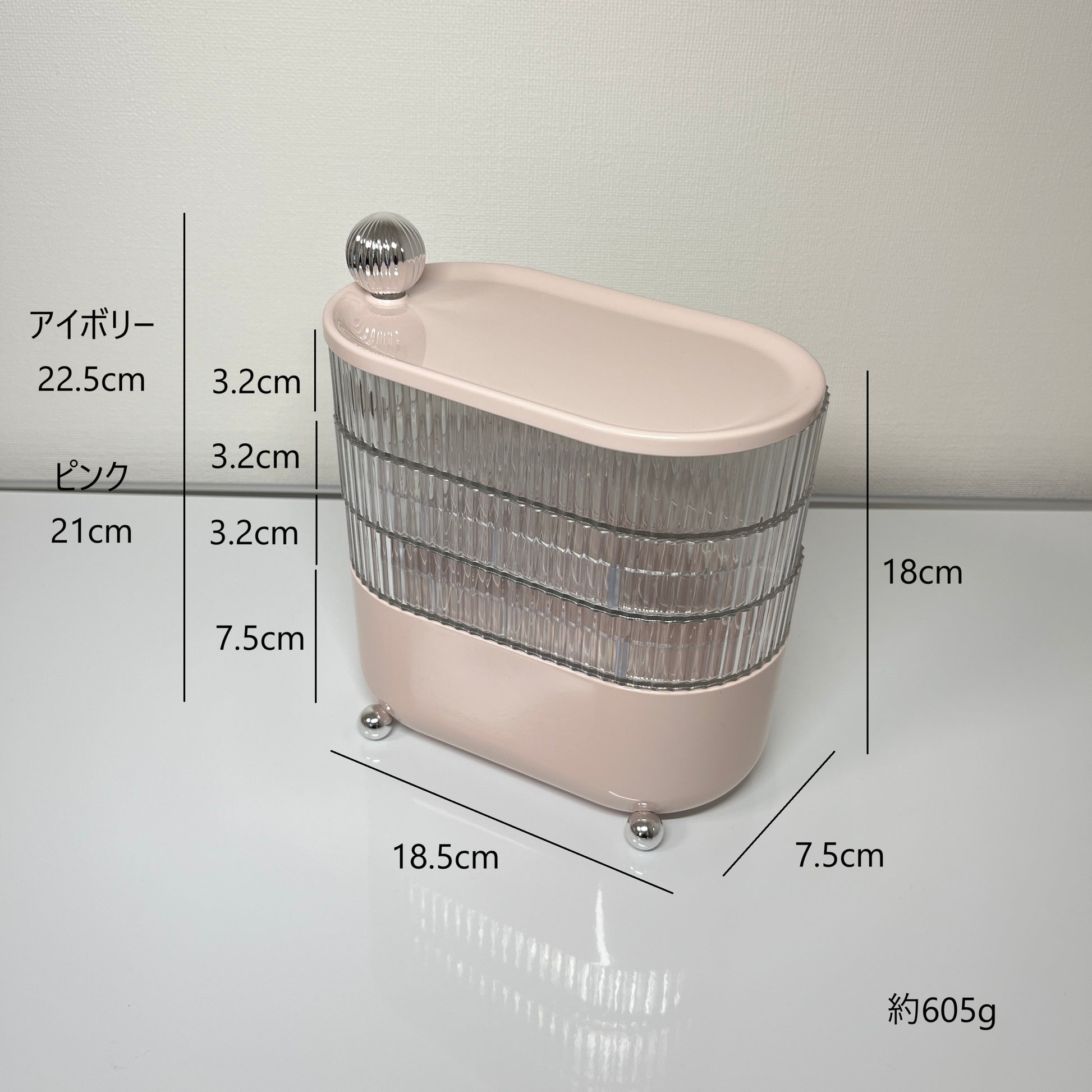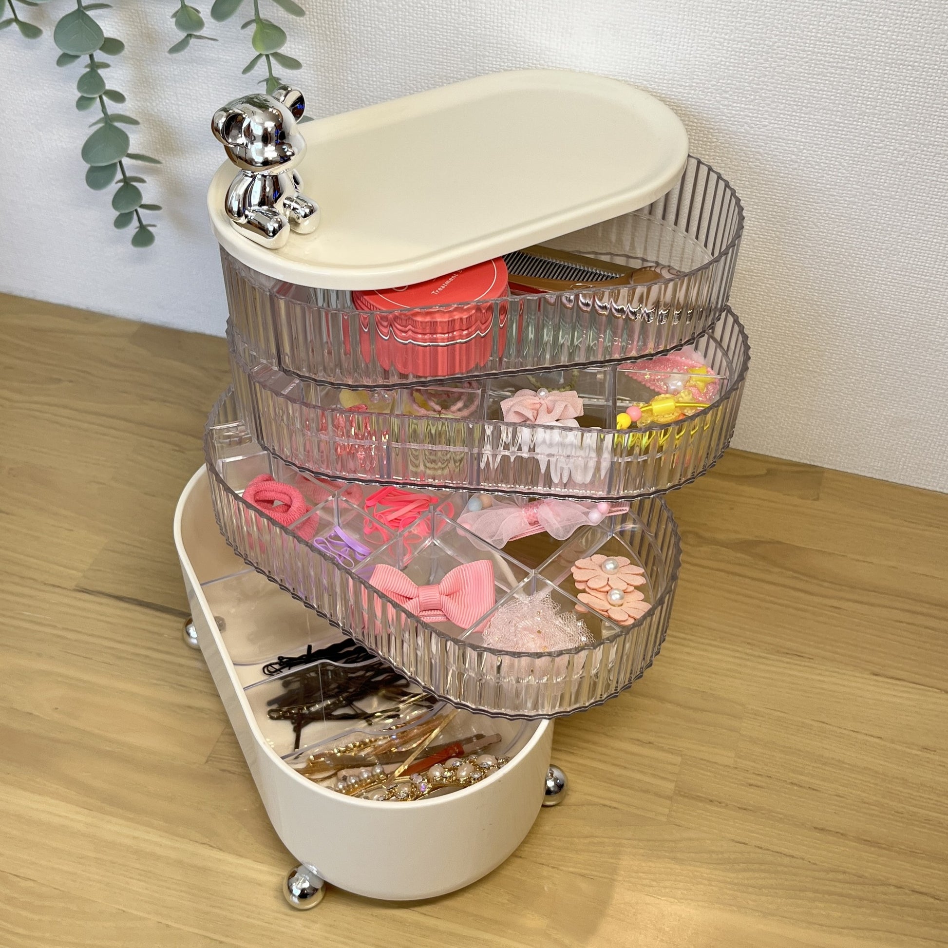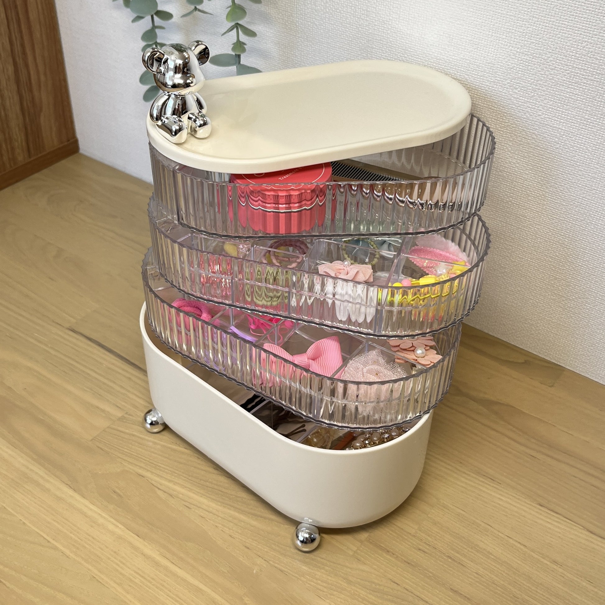 360度の回転式で、左右のどちらからでも引き出せる仕様。くるっと回すだけで必要な段にアクセスできるため、使用頻度の高いアイテムもストレスなく取り出せます。デスク上でも、キッチンやリビングのちょっとした隙間でも、使う人に合わせて自由なレイアウトが可能です。