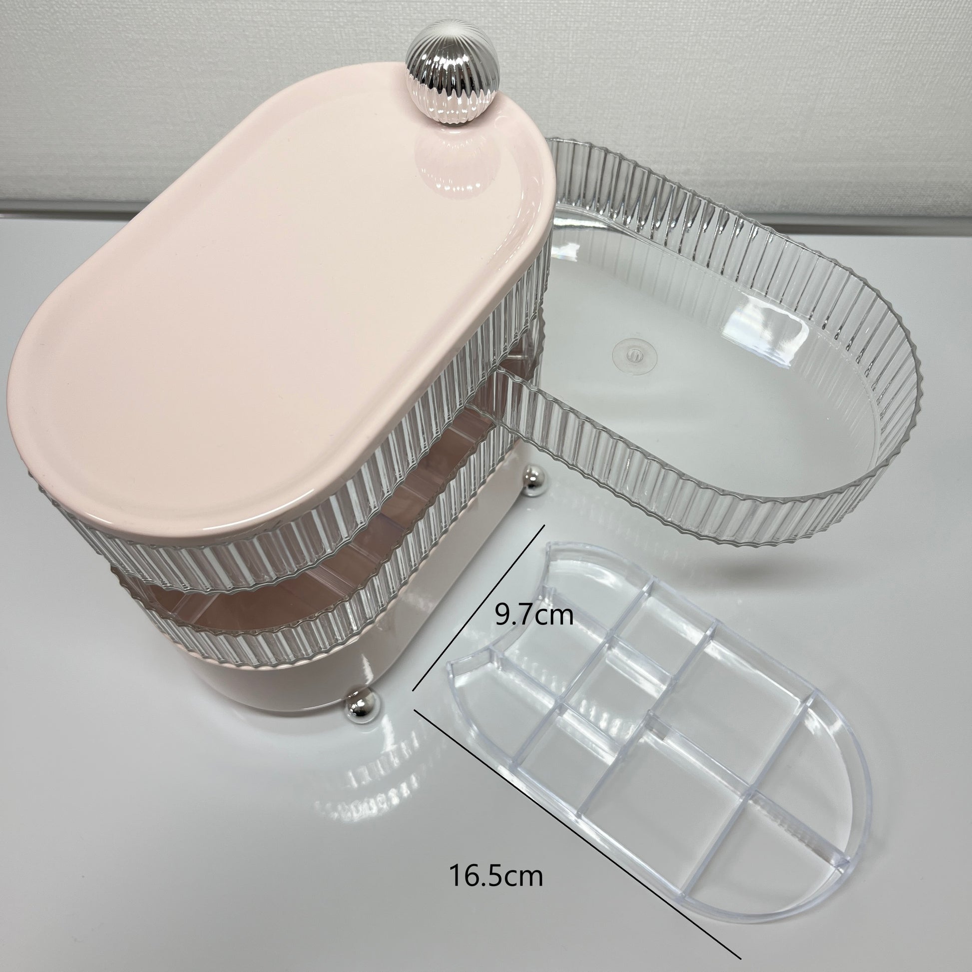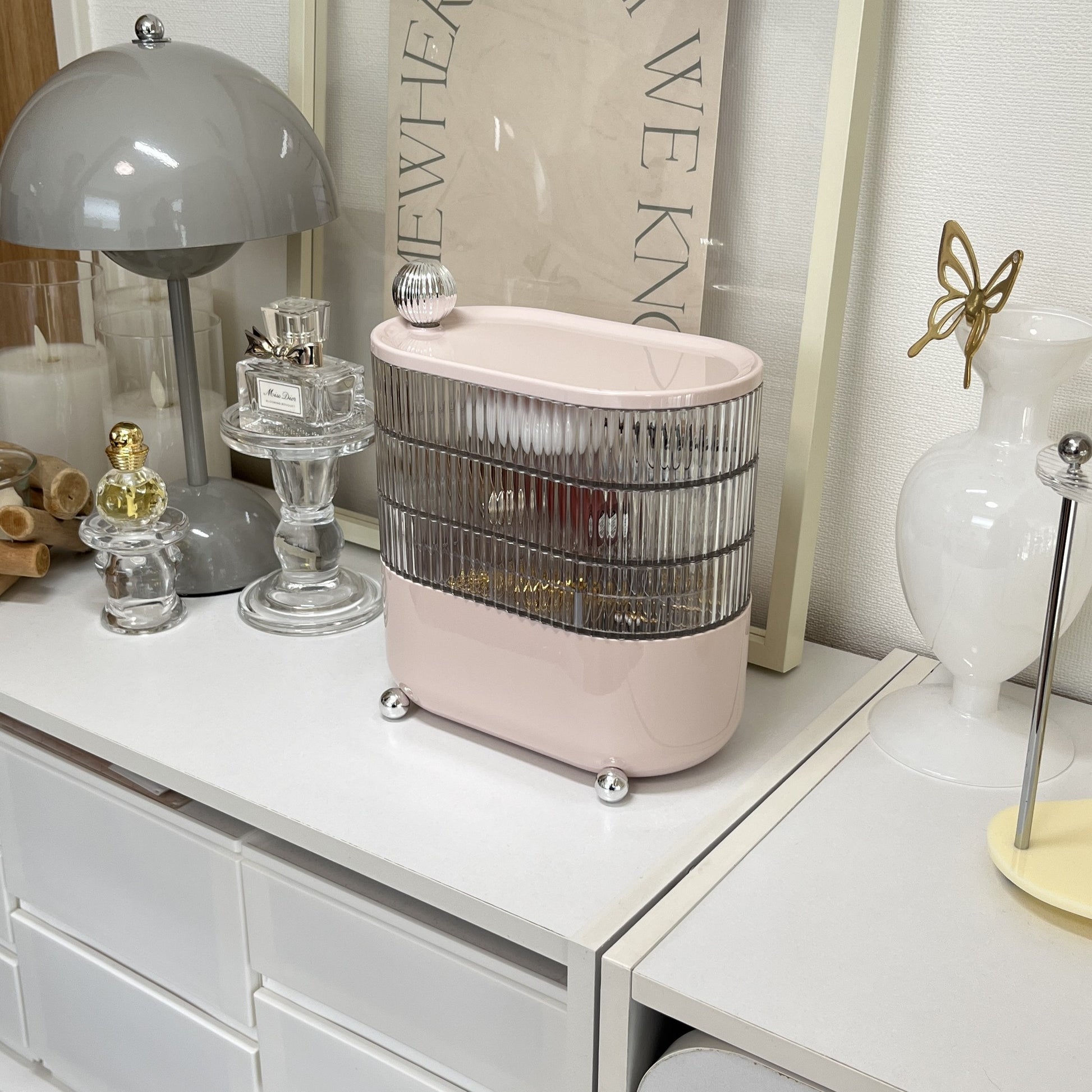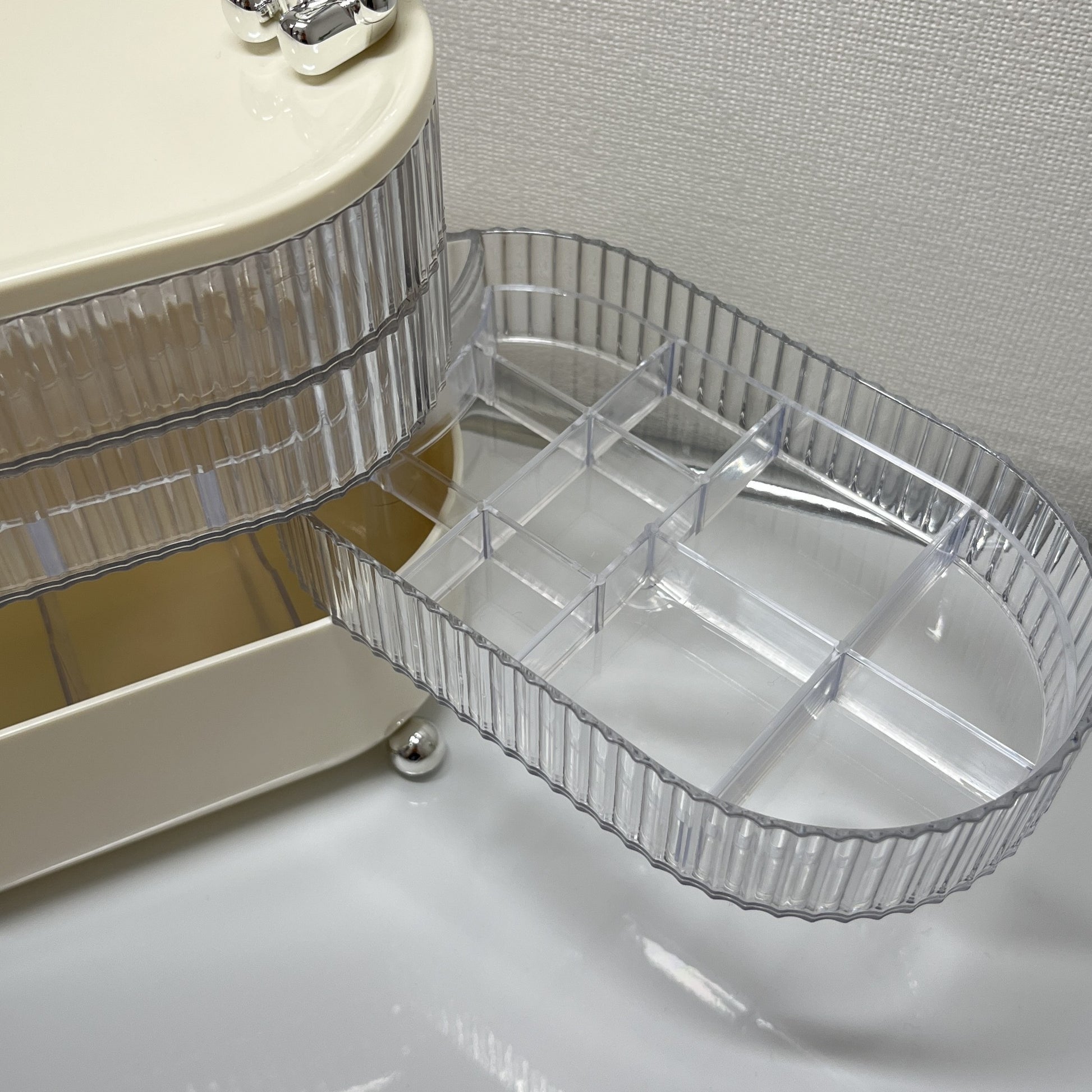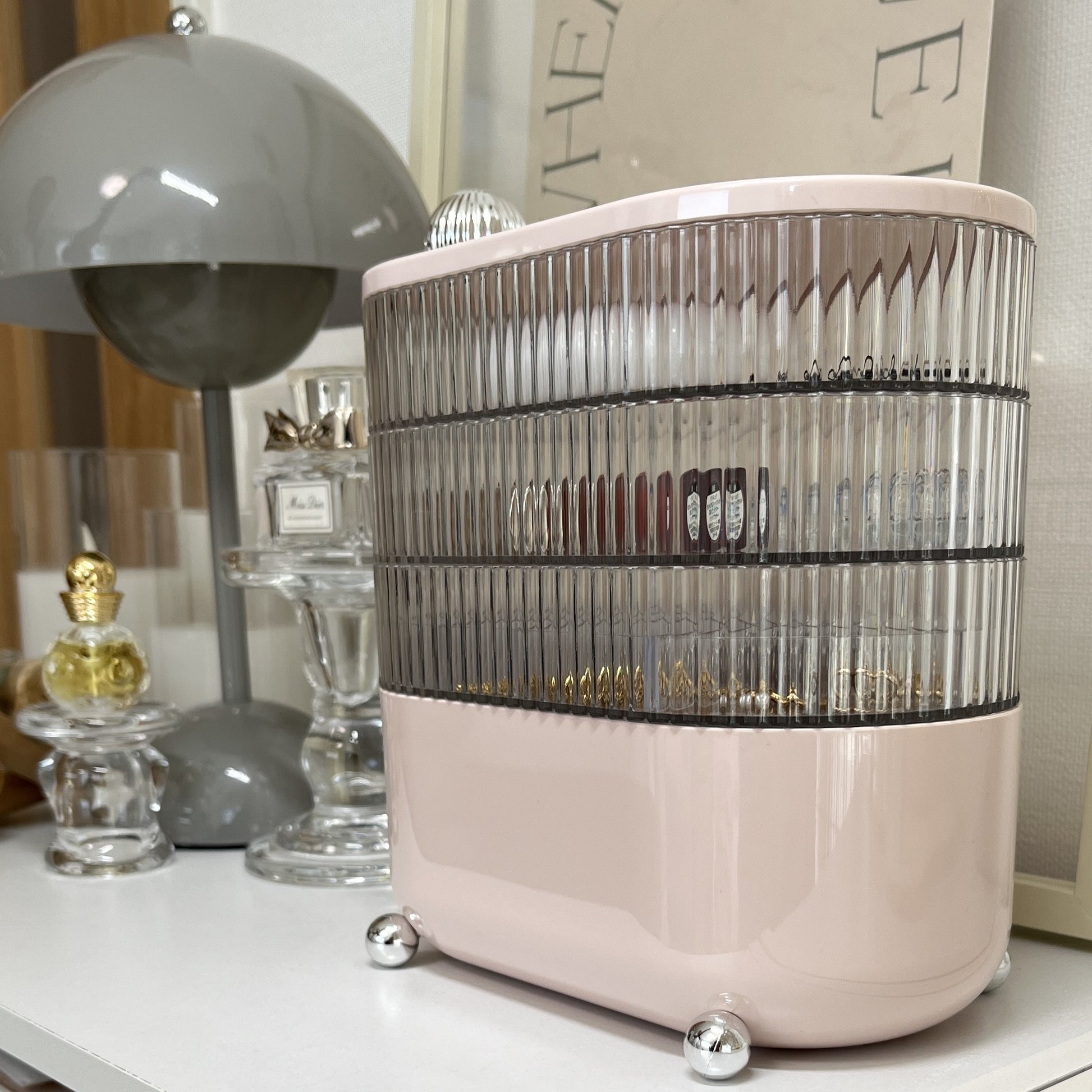 360度の回転式で、左右のどちらからでも引き出せる仕様。くるっと回すだけで必要な段にアクセスできるため、使用頻度の高いアイテムもストレスなく取り出せます。デスク上でも、キッチンやリビングのちょっとした隙間でも、使う人に合わせて自由なレイアウトが可能です。