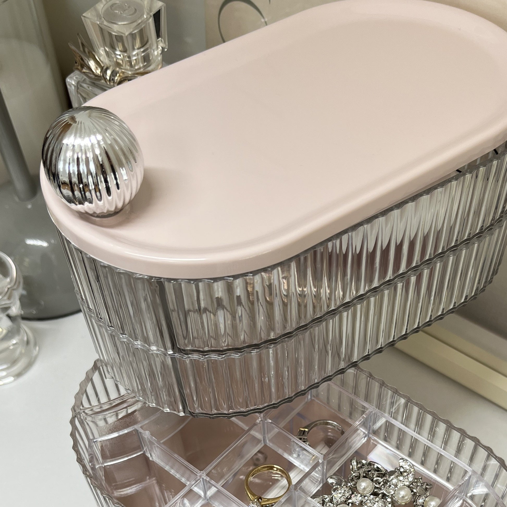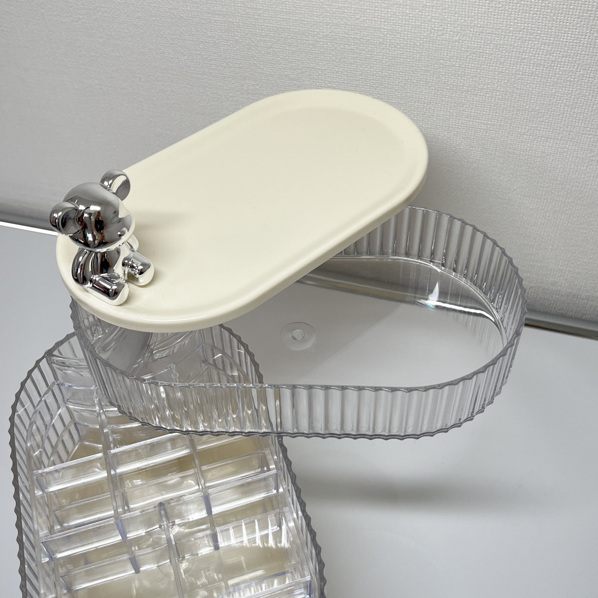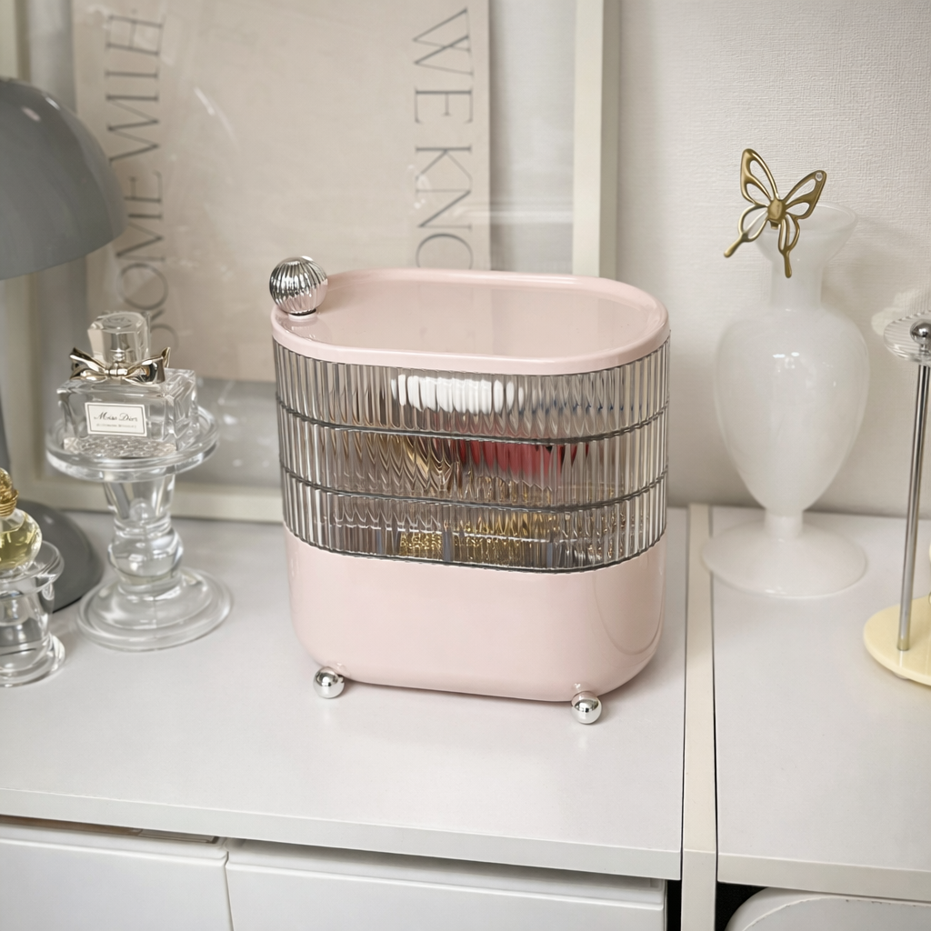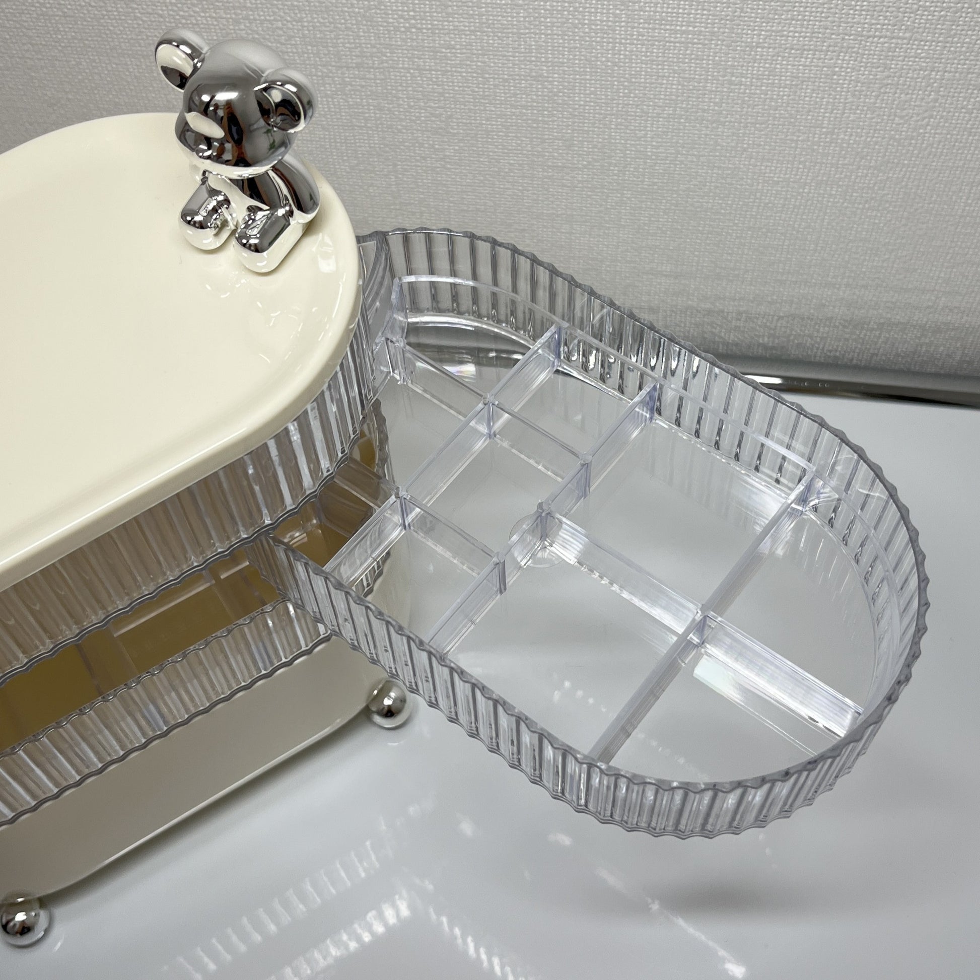360度の回転式で、左右のどちらからでも引き出せる仕様。くるっと回すだけで必要な段にアクセスできるため、使用頻度の高いアイテムもストレスなく取り出せます。デスク上でも、キッチンやリビングのちょっとした隙間でも、使う人に合わせて自由なレイアウトが可能です。