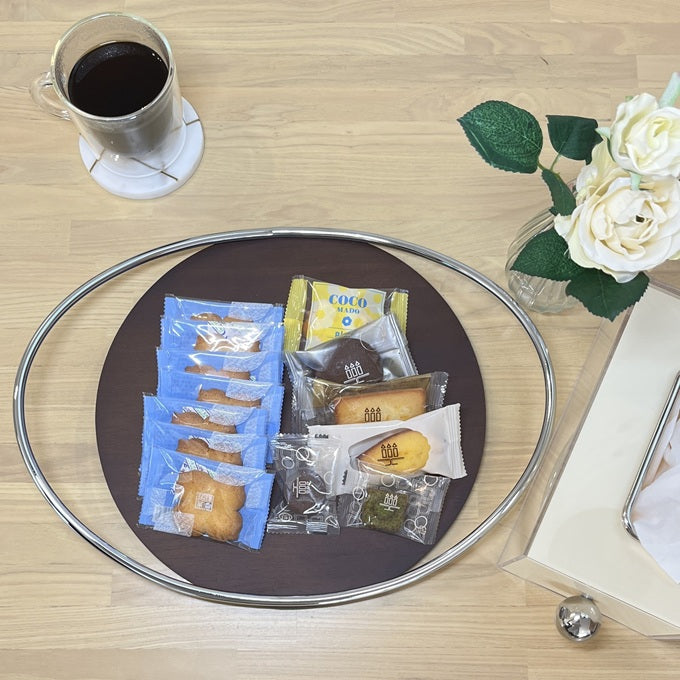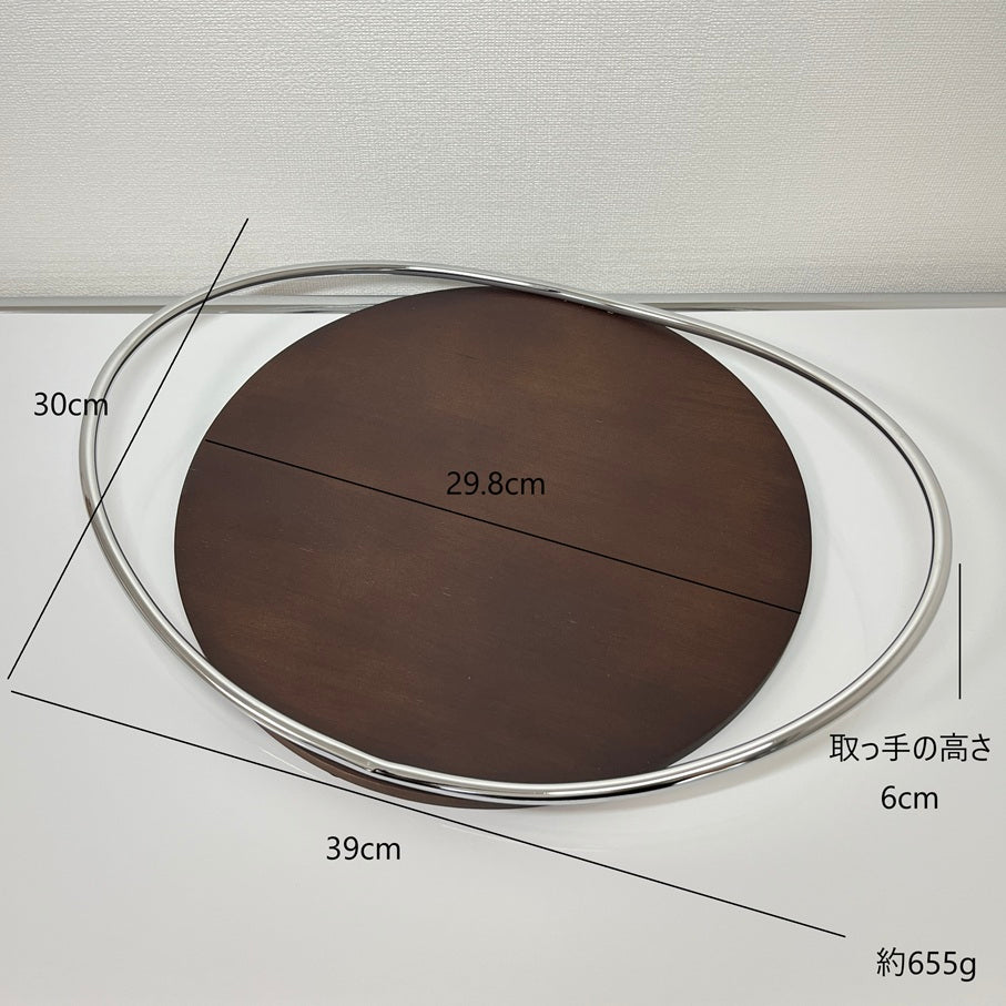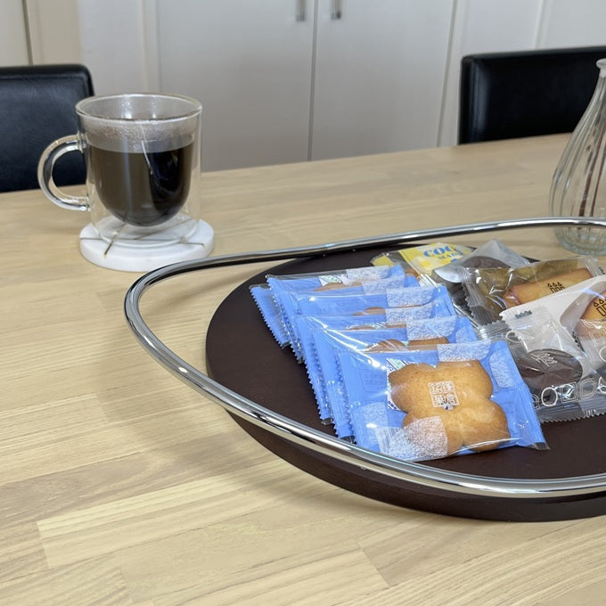 上質な木目のトレイに、シルバーの取っ手が組み合わさったデザイン。置いてあるだけで目を引く存在感があり、お部屋のアクセントになります。